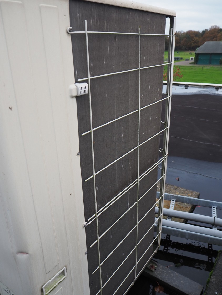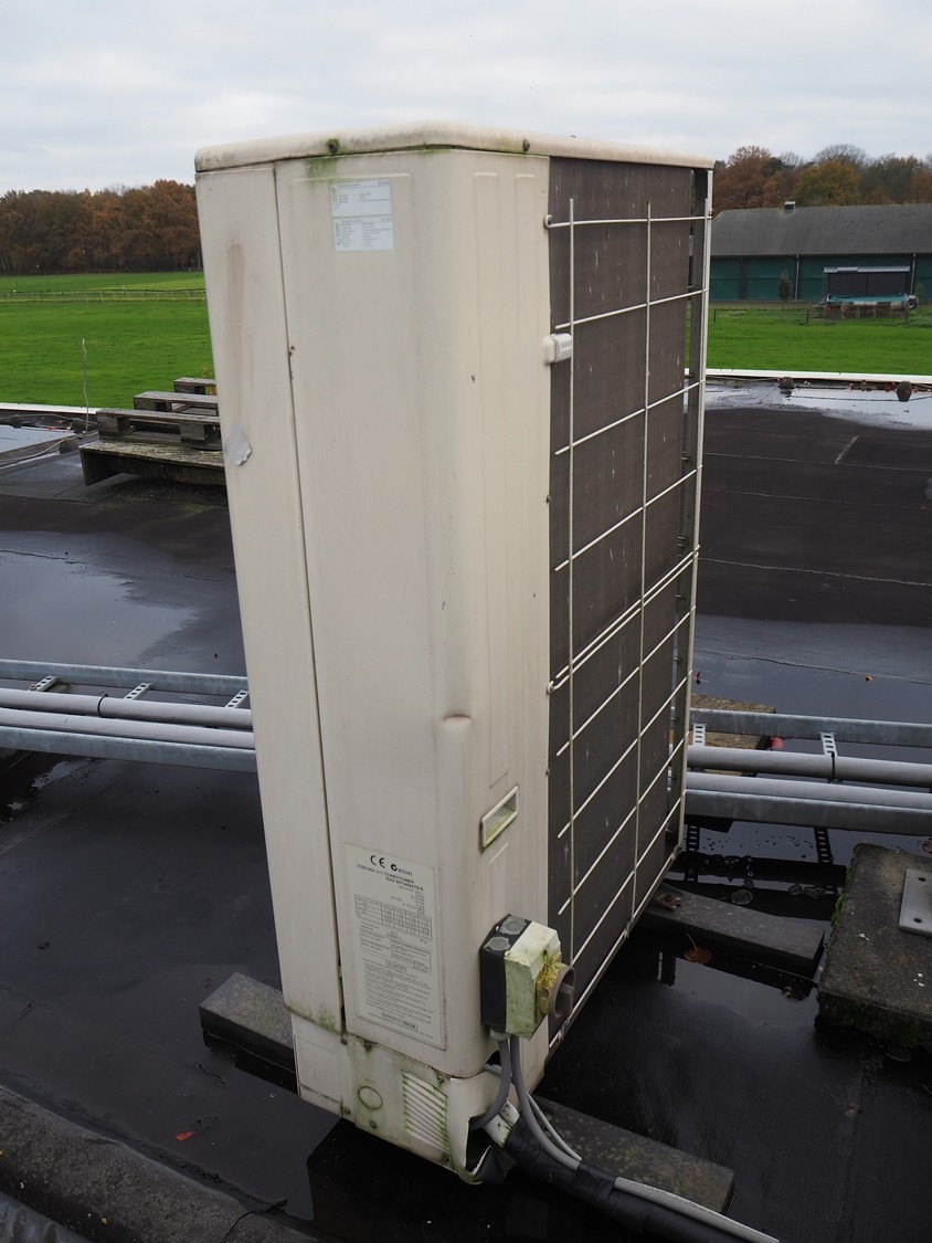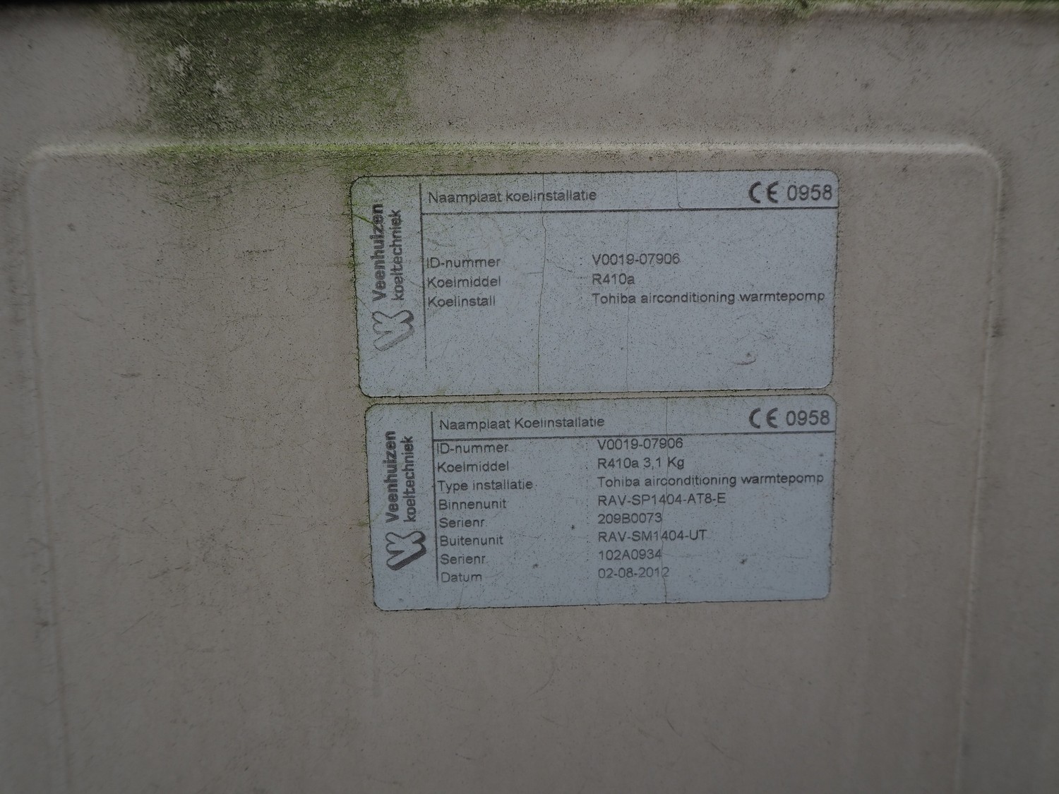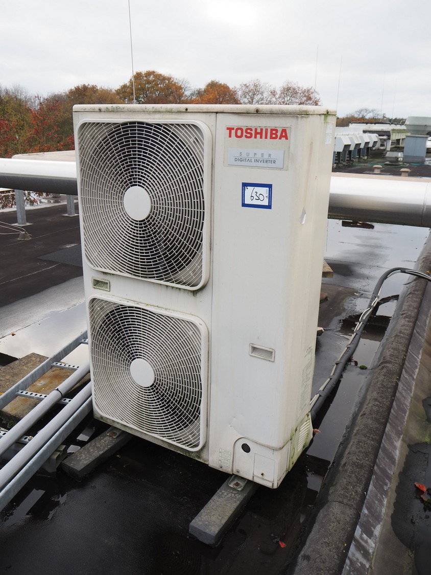 Toshiba outside air-conditioning unit, model: RAV-SP1404AT8-E, serial number: 204B0073, year of construction: 2012, 380-415 V, 3 Ph, 50 Hz, 10.61 kW, 16.4 A, refrigerant: R410A/3.1 kg, dimensions: 900 mm x 350 mm x 1300 mm. Situated on the roof.