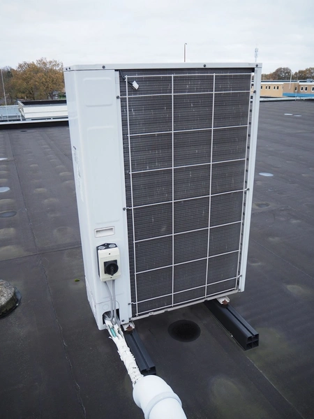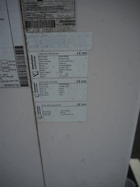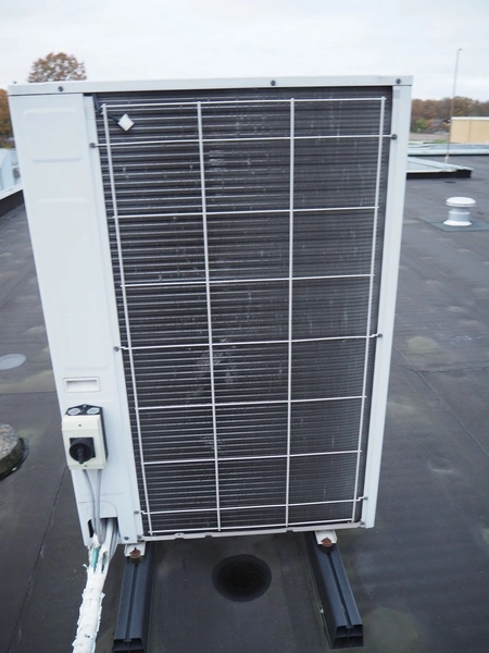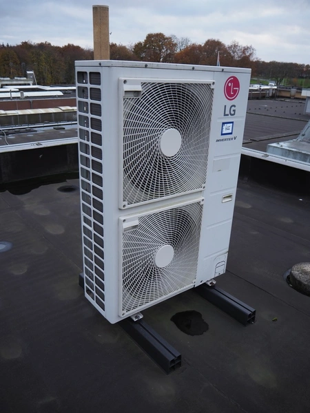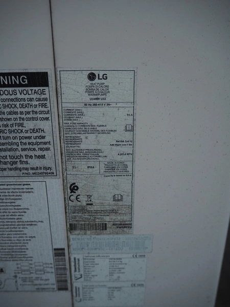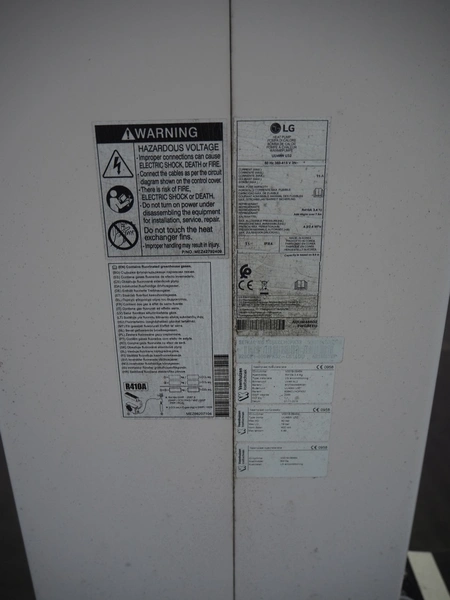 LG outside air-conditioning unit, model: UU49W U32, refrigerant: R410A/3.4 kg, dimensions: 950 mm x 350 mm x 1390 mm. Situated on the roof.