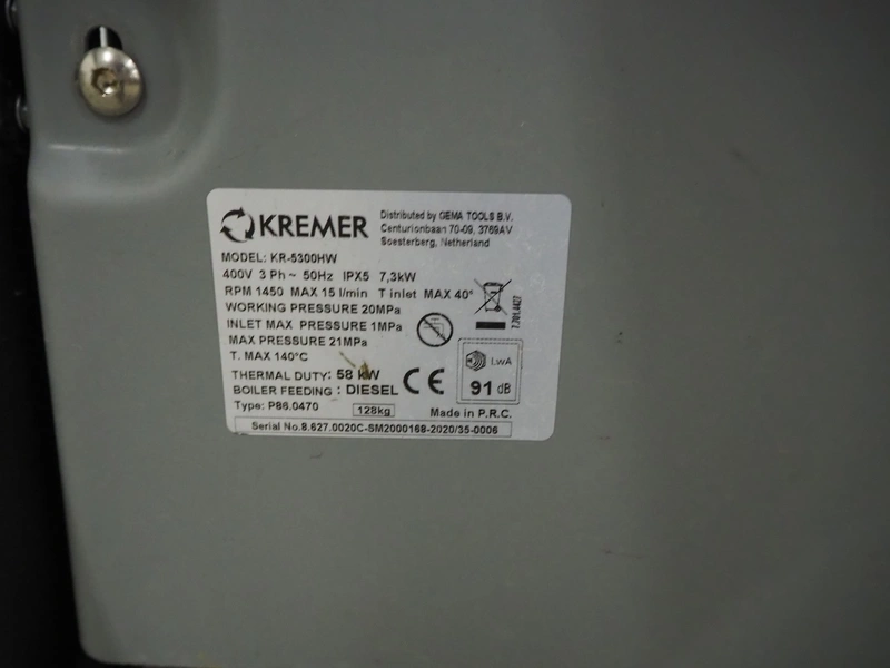 Kremer high pressure cleaner, model: KR-5300HW, 400 V, 3 Ph, 50 Hz, 7.3 kW, 1450 rpm, max 15 l/min, dimensions: 1500 mm x 1000 mm x 1700 mm.