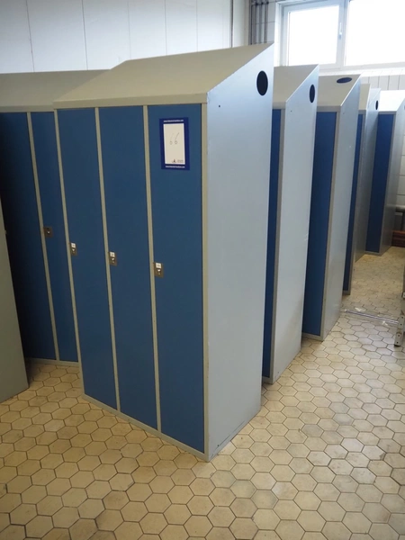 16 lockers, (13x) 3-doors, dimensions: (13x) 900 mm x 500 mm x 1840 mm, (3x) 16-doors, dimensions: (3x) 600 mm x 500 mm x 1950 mm. Keys are missing