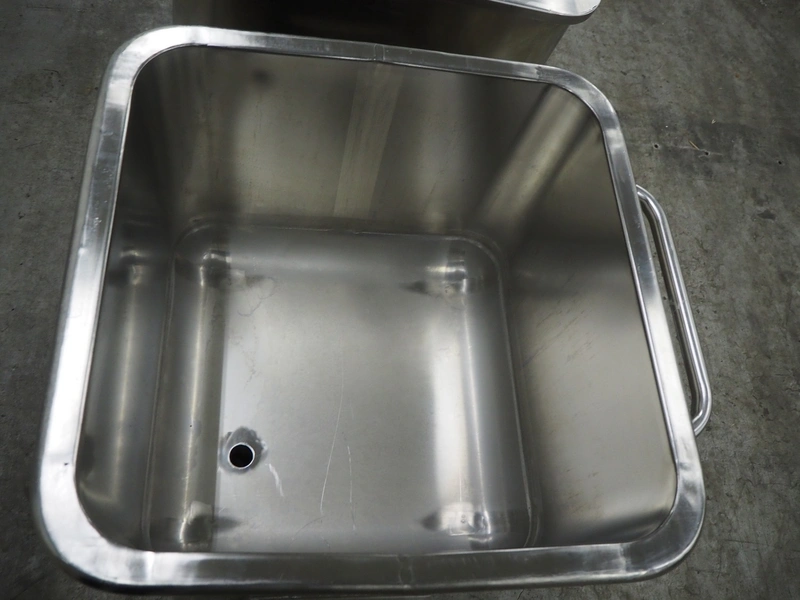 (2x) s/s 200 litres meat bins with cover, dimensions: (2x) 690 mm x 740 mm x 770 mm.