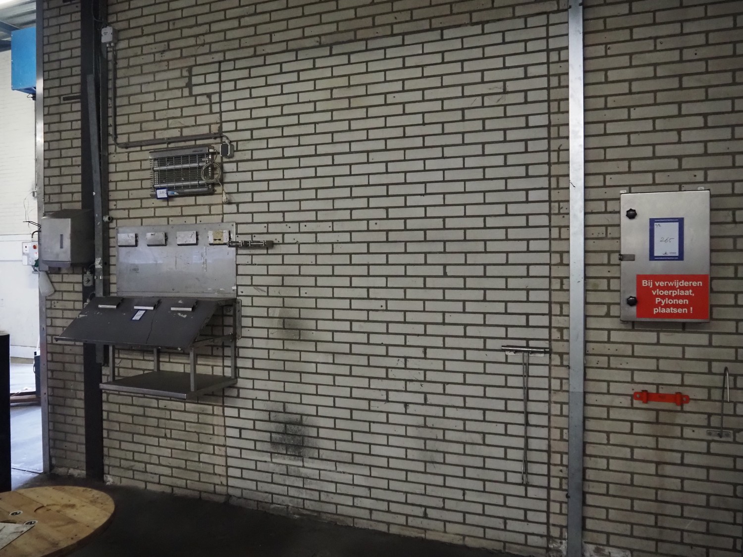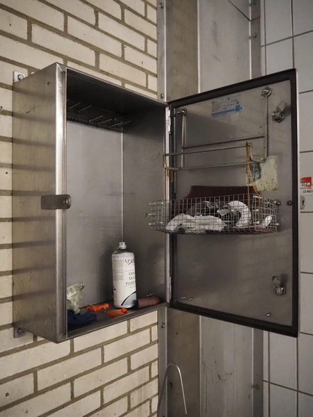 S/s wall mounted writing desk with s/s clipboard and s/s cabinet, dimensions writing desk: 1000 mm x 530 mm x 730 mm, dimensions cabinet: 380 mm x 240 mm x 600 mm.