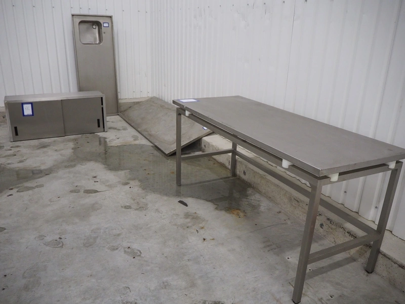 S/s sink, cabinet and table, dimensions sink: 1800 mm x 700 mm x 270 mm, dimensions cabinet: 1400 mm x 400 mm x 620 mm, dimensions table: 2000 mm x 800 mm x 930 mm.