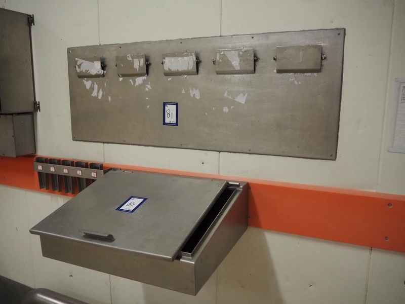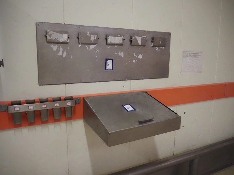 S/s wall mounted writing desk and s/s clipboard, dimensions cabinet: 600 mm x 500 mm x 200 mm.