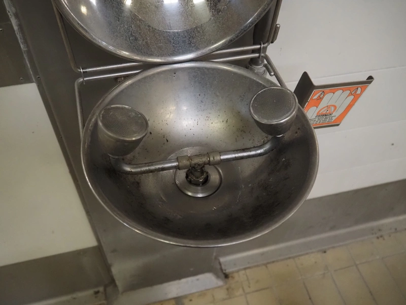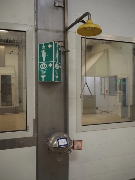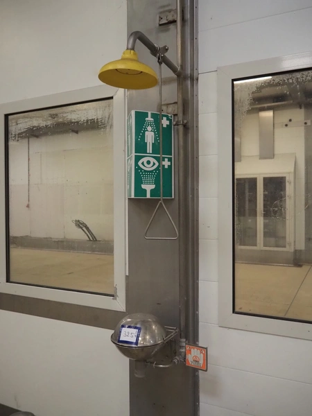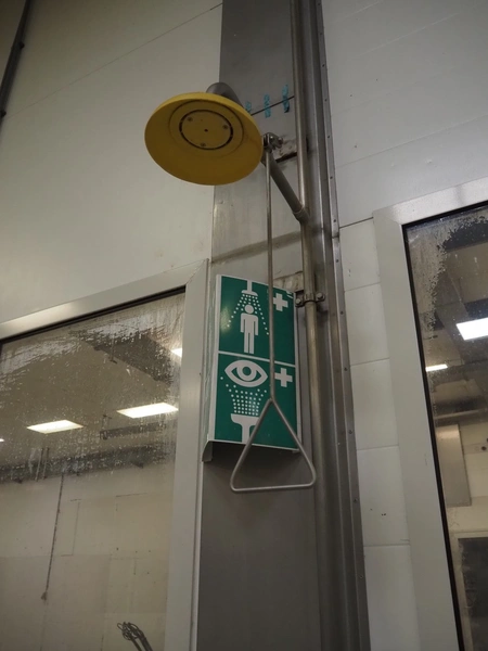 Safety shower, dimensions: 420 mm x 650 mm x 1420 mm.
