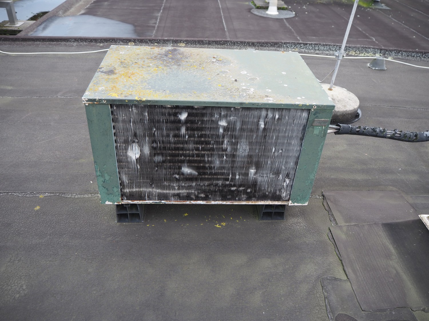 Refle cooling condensing unit, dimensions: 750 mm x 470 mm x 500 mm. Situated on the roof.