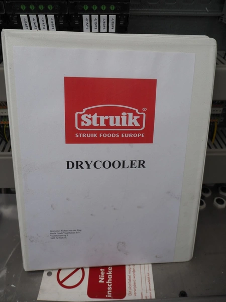 Alfa Laval condenser, 10 fans, type: BDDRE1005CD56 P SW, serial number: 30/259-101660-01, tear of construction: 2012, volume: 265.5 liters, TS: -40/110 °C, PS:-1/9 bar, refrigerant: Brine, empty weight: 1700 kg, on steel frame with switch cabinet, dimensions: 13000 mm x 2400 mm x 2300 mm. Situated on the roof. Can be picked-up at a later date as soon as the building will be demolished next year, a date for this is yet unknown.
