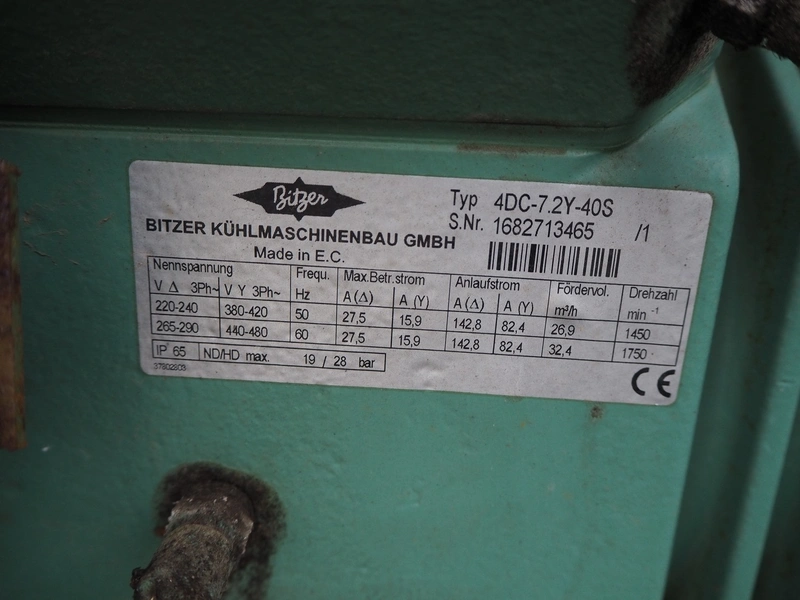Friga Systems B.V. condensing unit with Bitzer Kühlmaschinenbau GmbH cooling compressor, type: 4DC-7.2Y-40S, serial number: 1682713465, capacity: 26.9/32.4 m³/h, dimensions: 2950 mm x 1200 mm x 1200 mm. Situated on the roof. Can be picked-up at a later date as soon as the building will be demolished next year, a date for this is yet unknown.