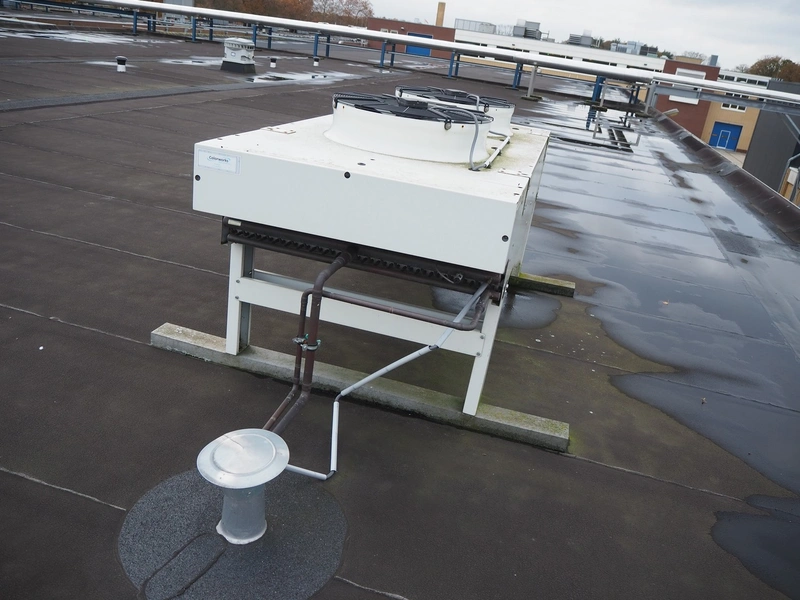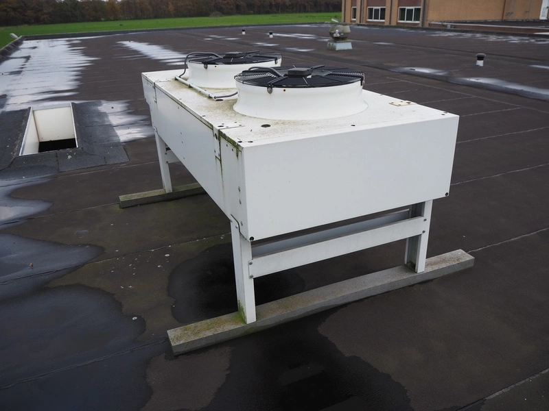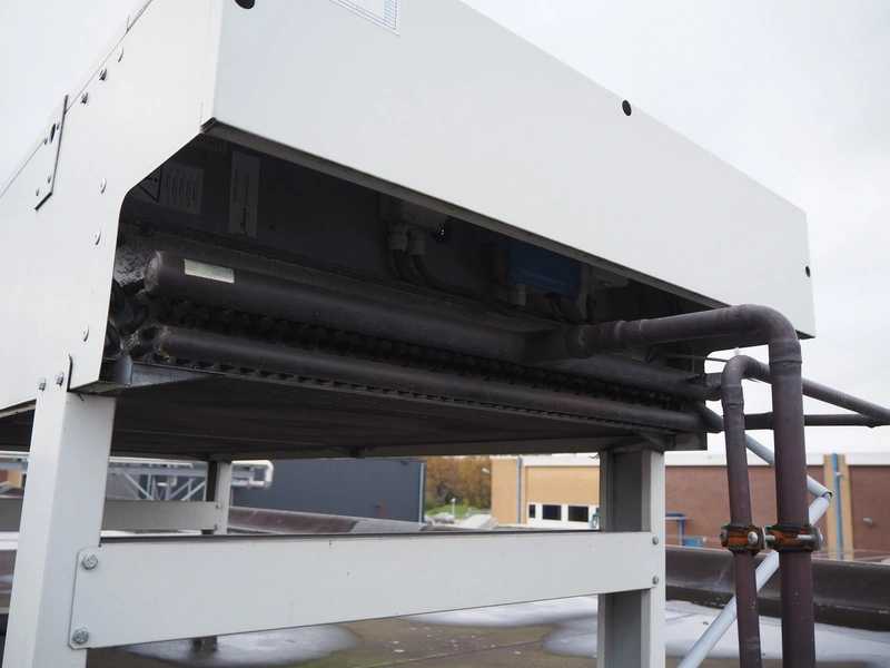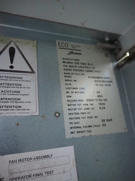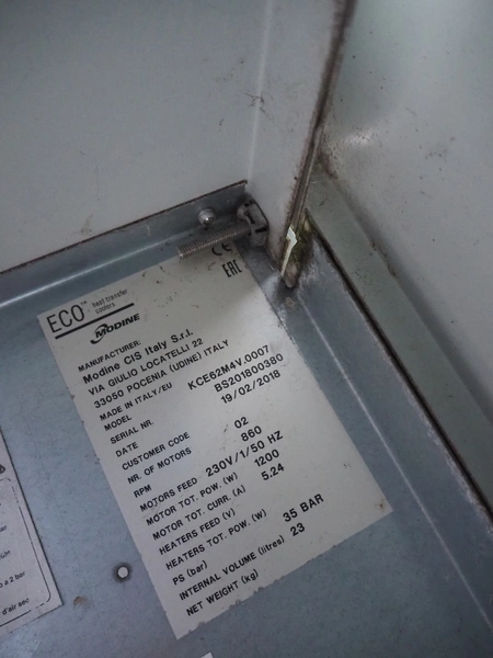 Modine CIS Italy S.r.l. condenser, 2 fans, model: KCE62M4V07, serial number: BS201800380, year of construction: 19/02/2018, 230 V, 1 Ph, 50 Hz, 1200 W, 5.24 A, PS: 35 bar, volume: 23 litres, dimensions: 2600 mm x 1060 mm x 1100 mm. Situated on the roof.