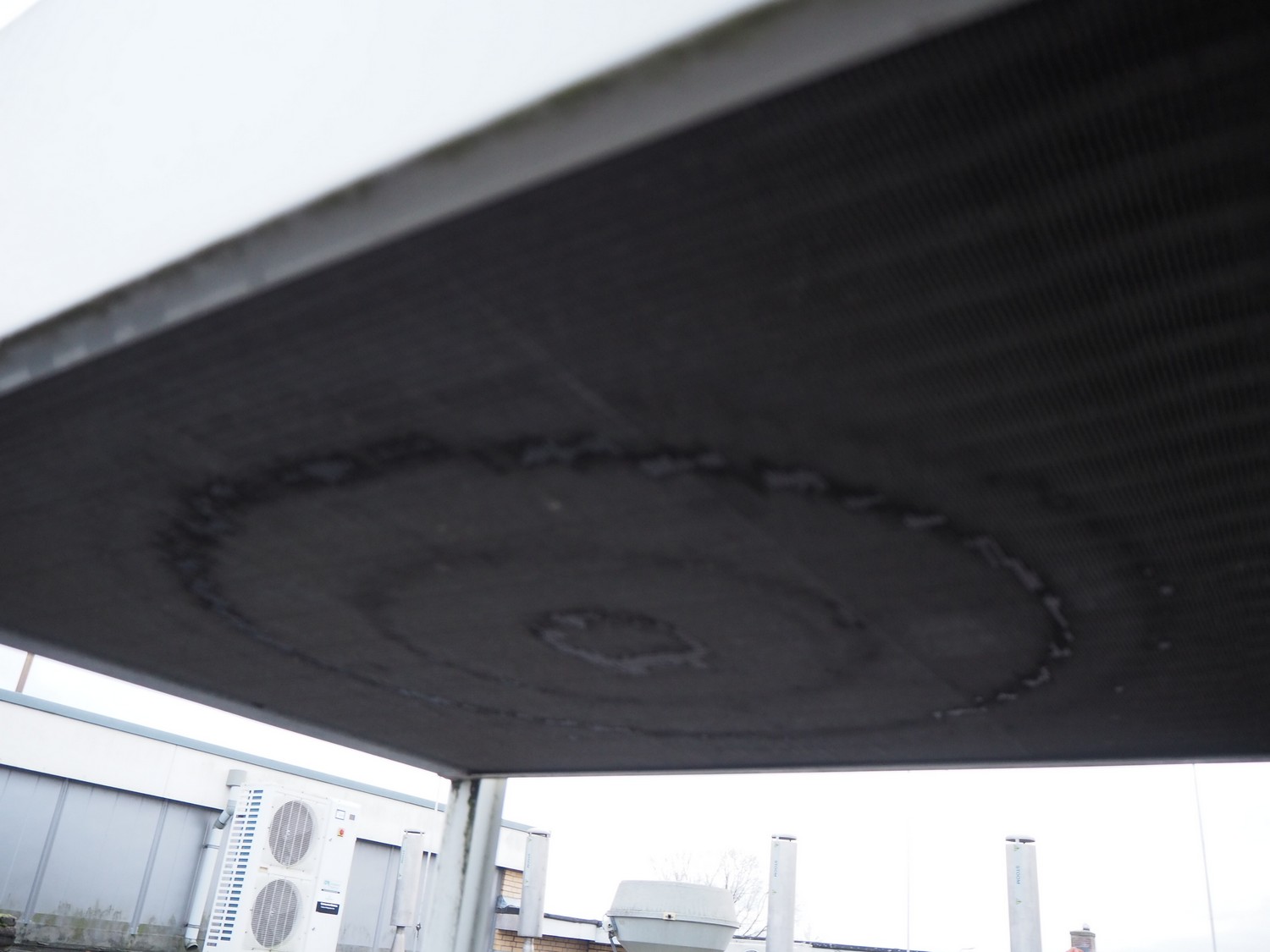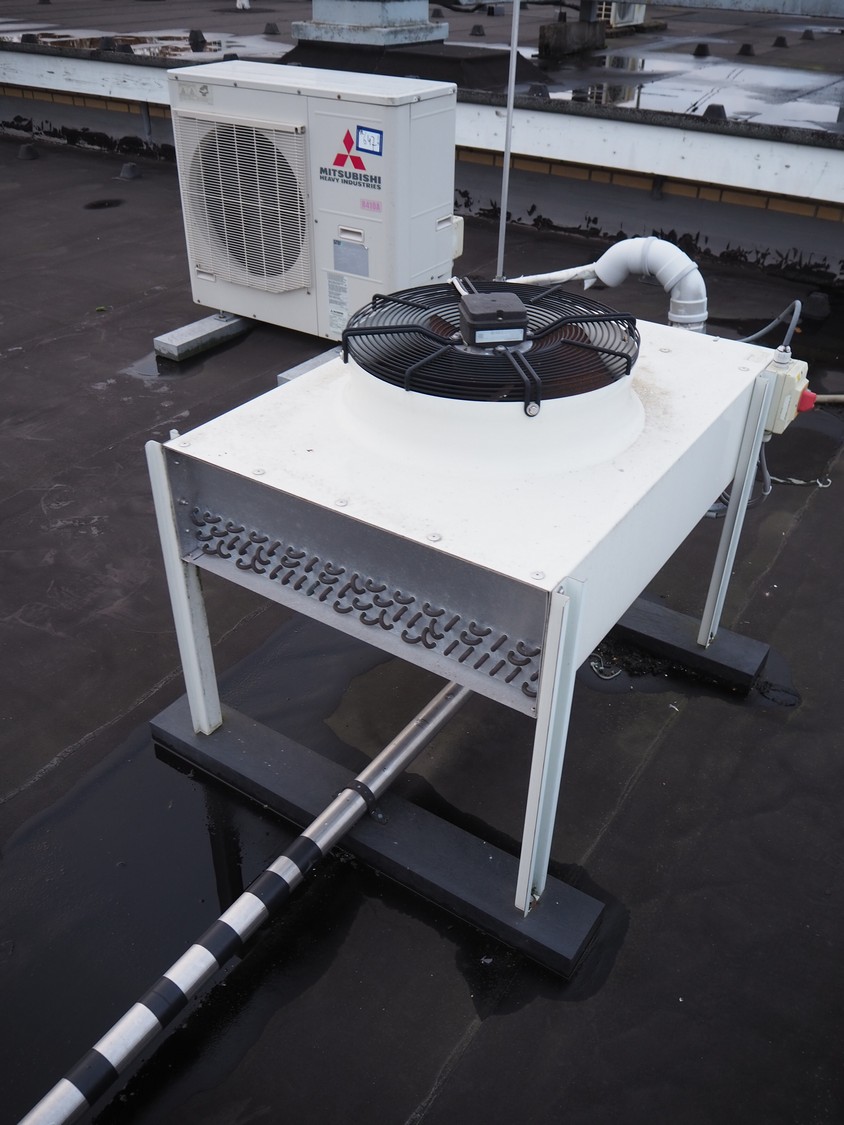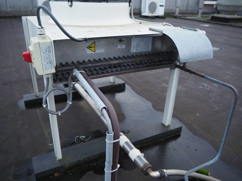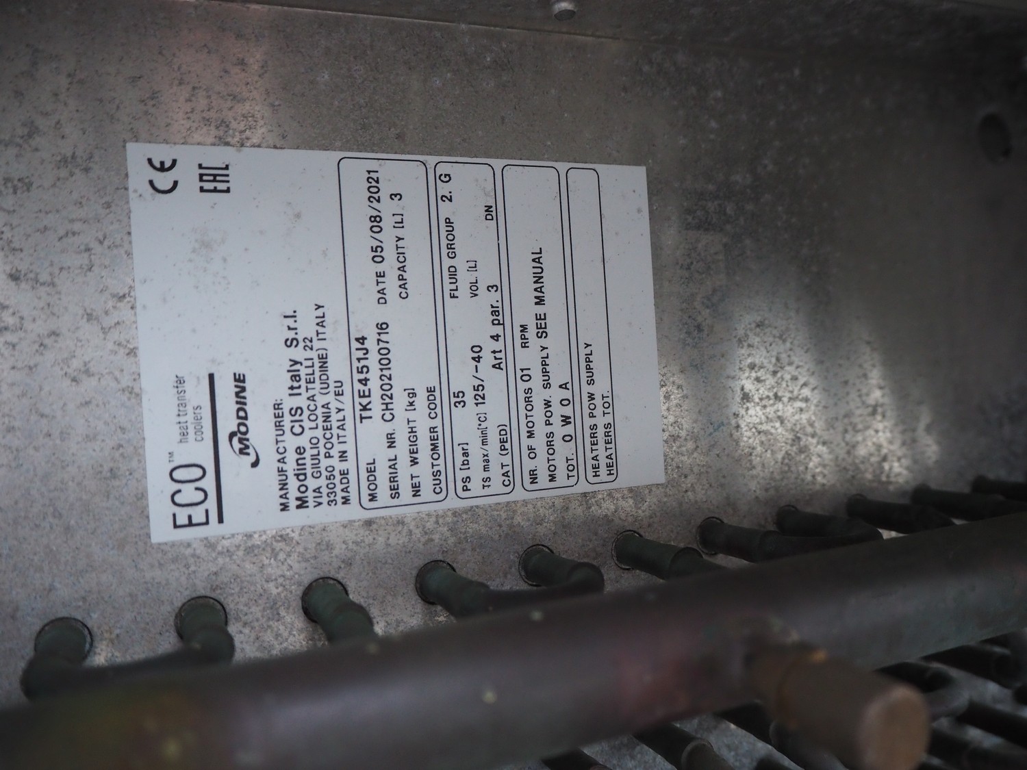 Modine CIS Italy S.r.l. condenser, 1 fan, model: TKE451J4, serial number: CH202100716, year of construction: 05/08/2021, PS: 35 bar, TS max/min: 125/-40 °C, capacity: 3 litres, dimensions: 1000 mm x 730 mm x 800 mm. Situated on the roof.