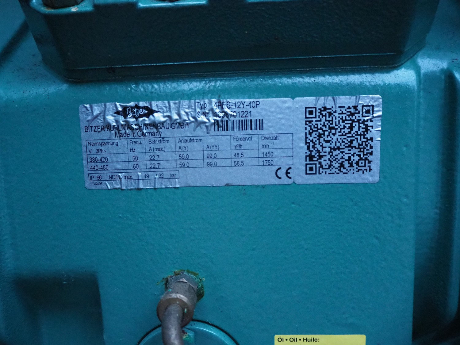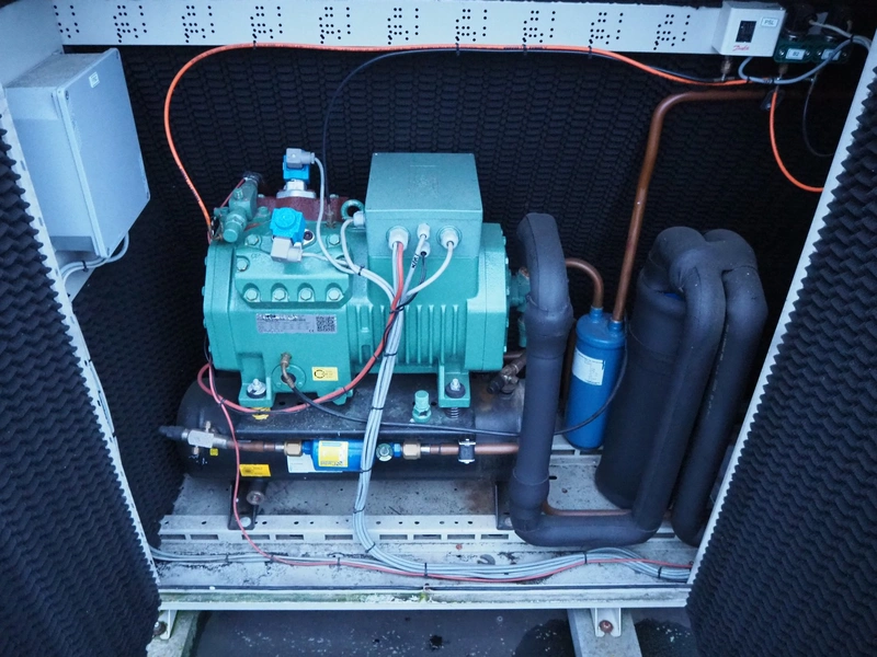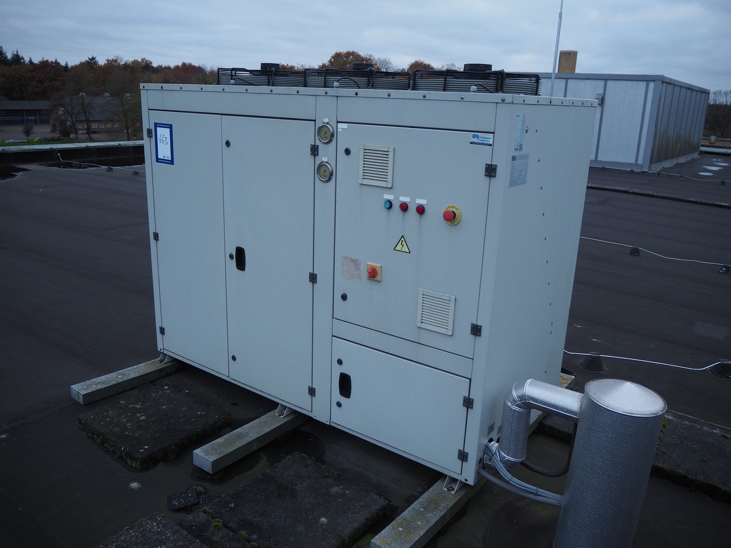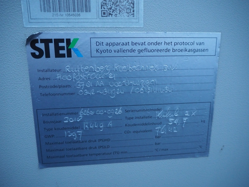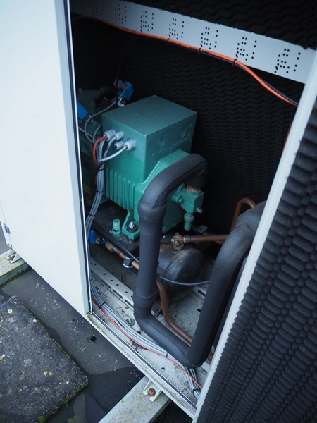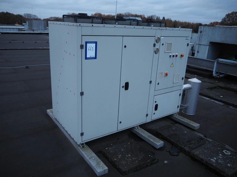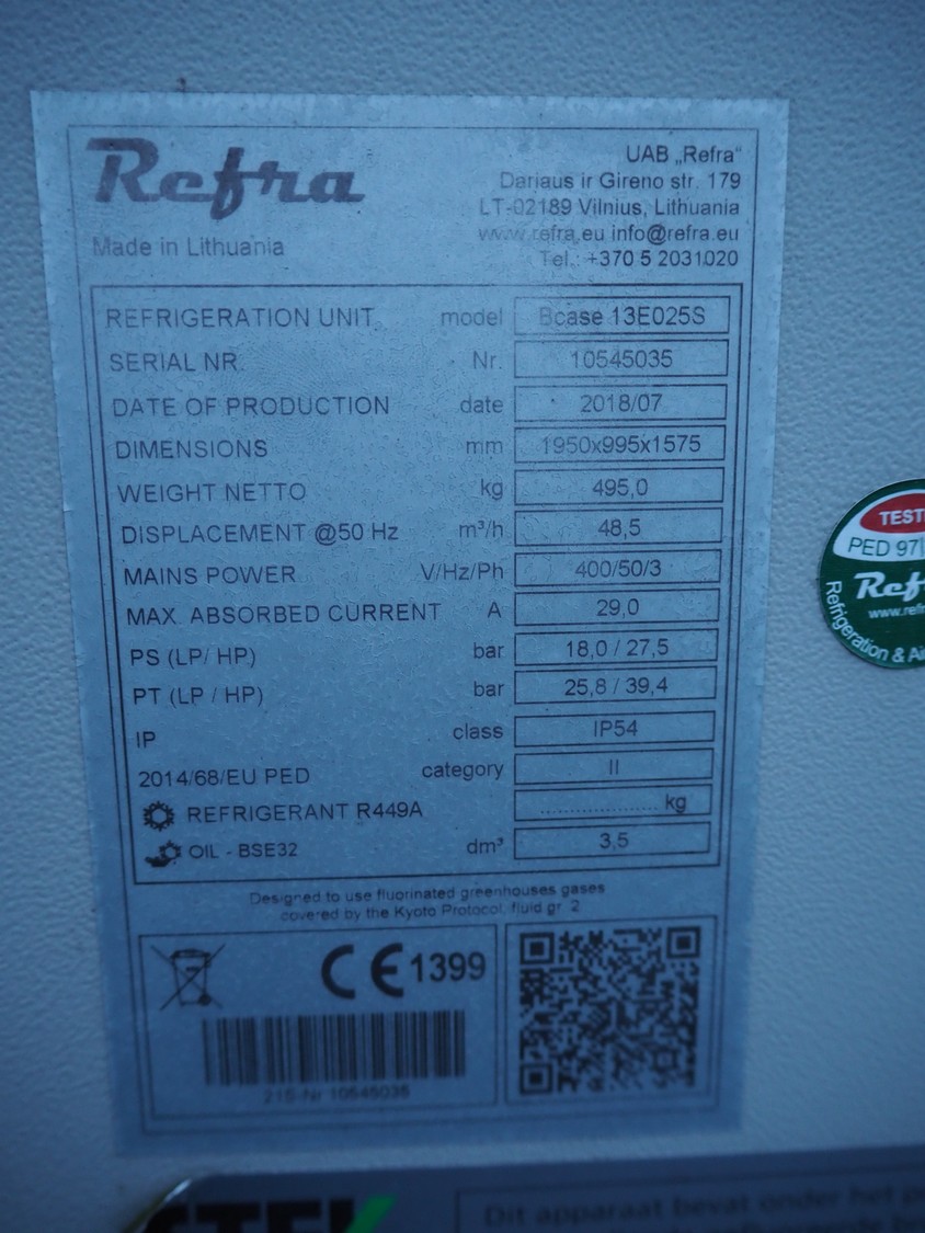 Refra refrigeration unit with Bitzer Kühlmaschinenbau GmbH cooling compressor, model: Bcase 13E025S, serial number: 10545035, year of construction: 2018/07, 400 V, 3 Ph, 50 Hz, 29.0 A, 48.5 m³/h, PS: 18.0/27.5 bar, refrigerant: R449A/54.7 kg, net weight: 495 kg, dimensions: 1950 mm x 995 mm x 1575 mm. Situated on the roof. Can be picked-up at a later date as soon as the building will be demolished next year, a date for this is yet unknown.
