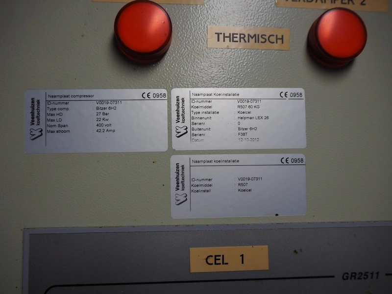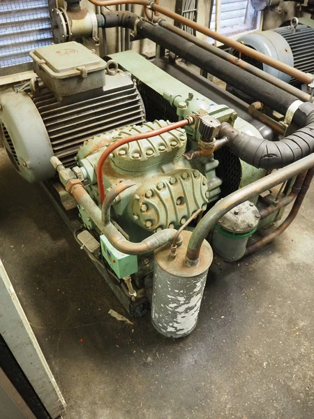 2 Bitzer Kühlmaschinenbau GmbH cooling compressors, type: 6H2, 400 V, 42.2 A, 22 kW, refrigerant: R507, dimensions: 900 mm x 1400 mm x 700 mm, including switch cabinet, dimensions: 1000 mm x 320 mm x 1200 mm.