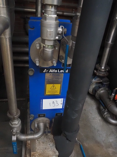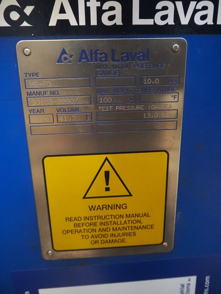 Alfa Laval plate heat exchanger, type: M6-FG, manufacturing number: 30103-29907, year of construction: 2001, volume: 41.7 litres, maximum pressure: 10.0 bar, maximum temperature: 100°C, dimensions: 700 mm x 320 mm x 1200 mm.