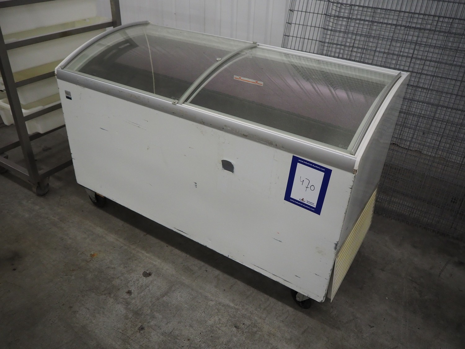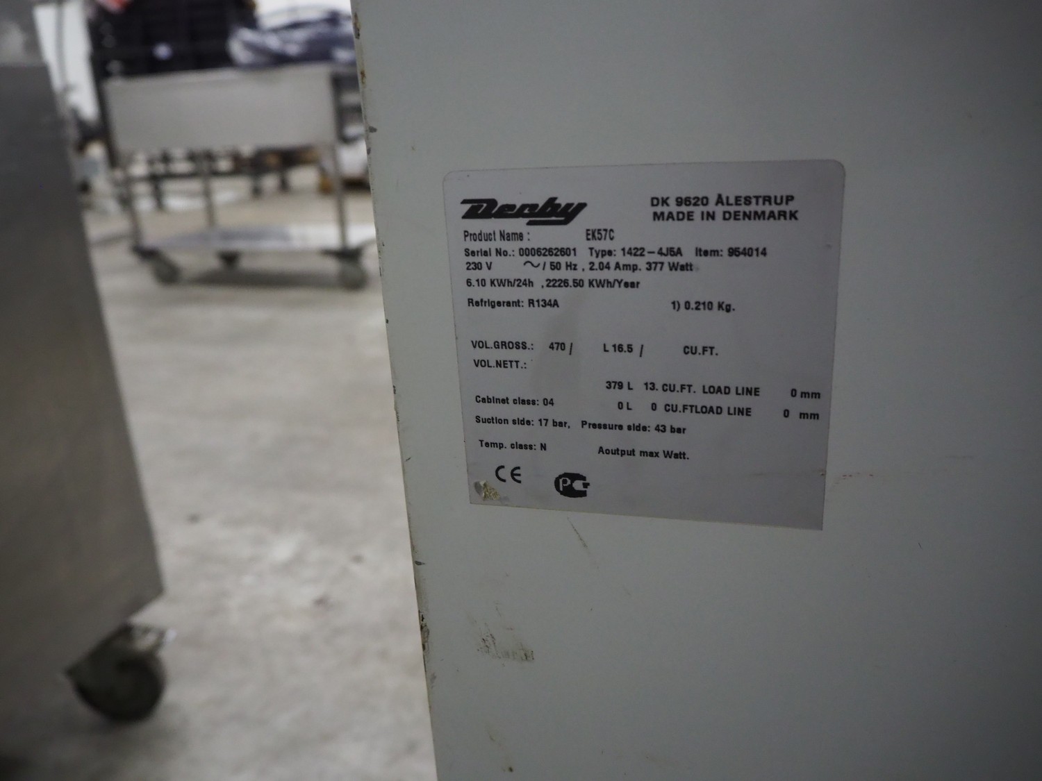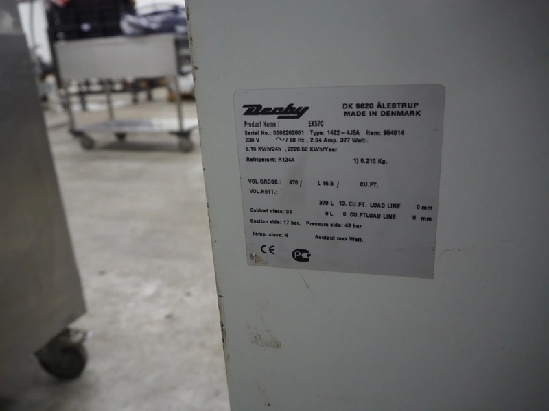 Derby freezer, type: 1422-4J5A, serial number: 0006262601, 230 V, 50 Hz, 2.04 A, refrigerant: R134A/0.210 kg, inside dimensions: 530 mm x 1380 mm x 680 mm, total dimensions: 1500 mm x 650 mm x 960 mm.