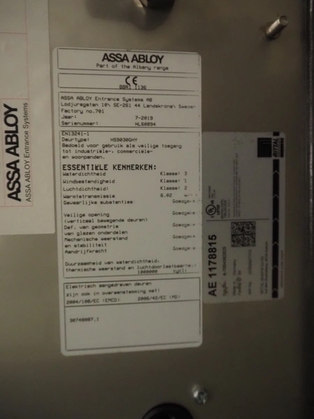 Assa Abloy Entrance Systems AB high speed shutter door, type: HS9030GHY, serial number: NL60894, year of construction: 07-2019, door size: 2500 mm x 3500 mm.