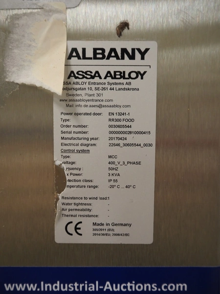 Assa Abloy Entrance Systems AB high speed shutter door, type: RR300 FOOD, serial number: 000000002810000415, year of construction: 24-04-2017, 400 V, 3 Ph, 50 Hz, 3 kva, door size: 2400 mm x 2800 mm.