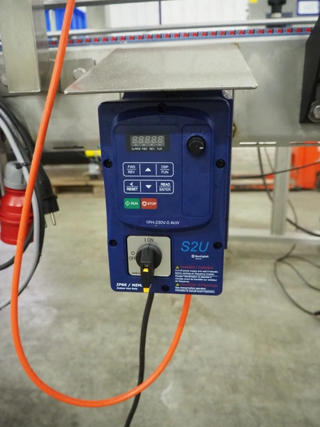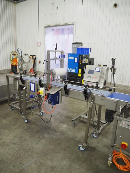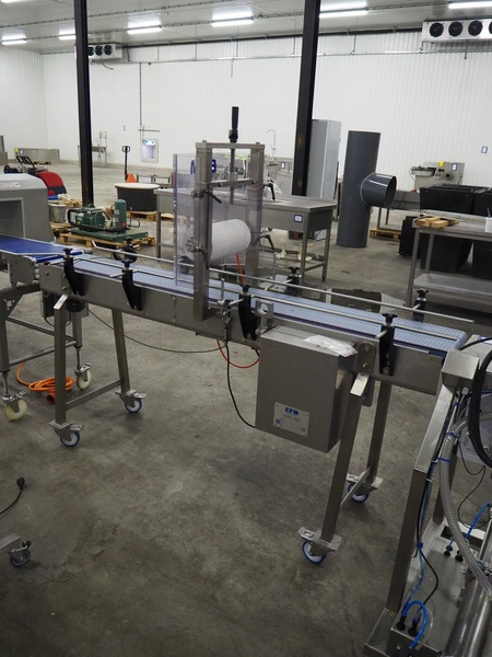 EFM Machinery mobile closing conveyor for buckets, type: AANROLBAND, serial number: 21181, year of construction: 2022, 230/400 V, 50 Hz, 0.4 kW, belt width: 250 mm, roll width: 300 mm, total dimensions: 2030 mm x 710 mm x 1700 mm.