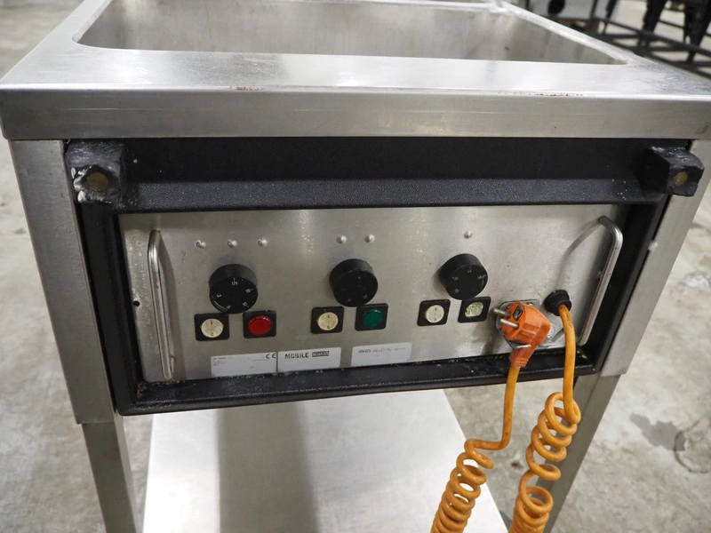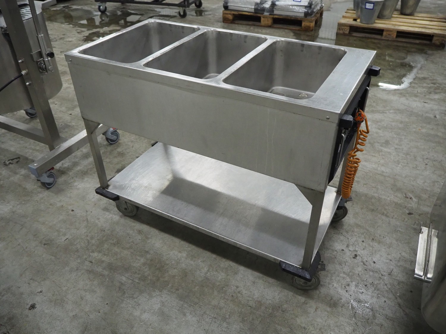 S/s mobile au-bain marie, inside dimensions: (3x) 305 mm x 510 mm x 220 mm, total dimensions: 1140 mm x 560 mm x 900 mm.
