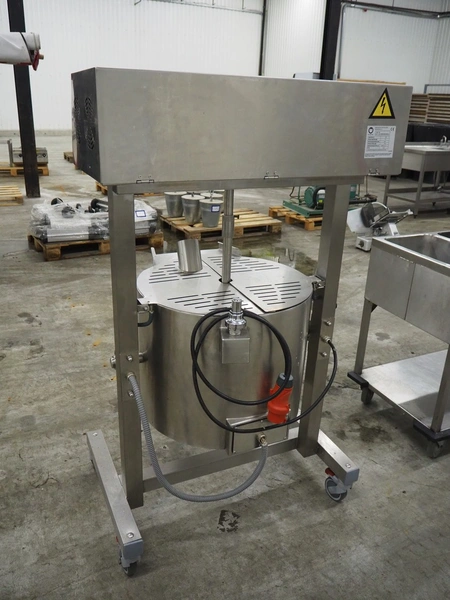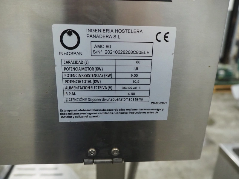 Inhospan cooking kettle with agitator, model: AMC 80, serial number: 20210628268C80ELE, year of construction: 28-06-2021, 380/400 V, 3 Ph, 10.5 kW, volume: 80 litres, dimensions: 1020 mm x 620 mm x 1530 mm.