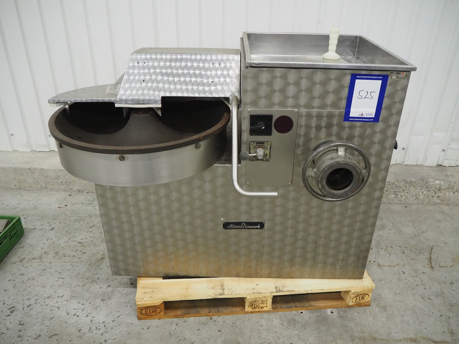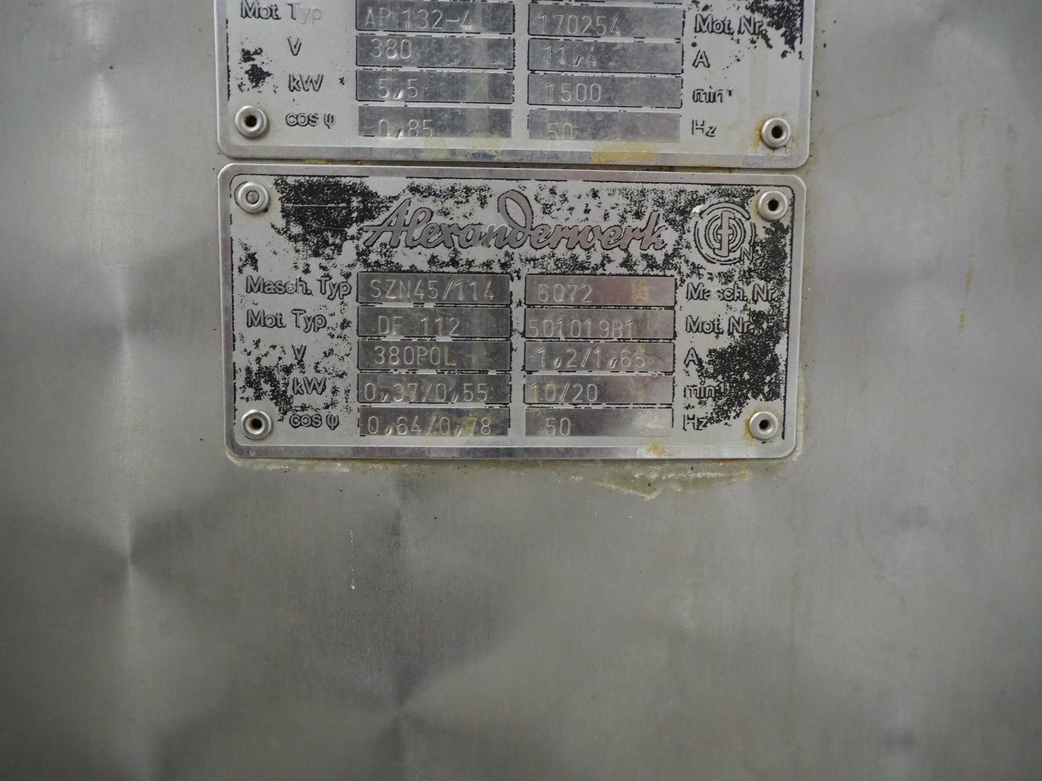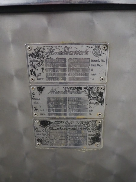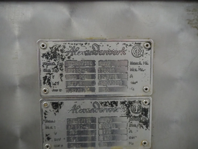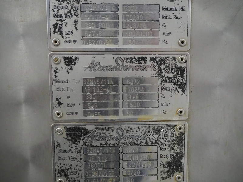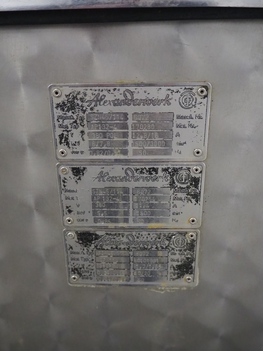 Alexanderwerk cutter/grinder, type: SZN45/114, number: 6072, 380 V, 50 Hz, 11.4 A, 5.5 kW, Ø bowl: 800 mm, Ø plate: 113 mm, total dimensions: 1500 mm x 900 mm x 1090 mm. Technical condition unknown.