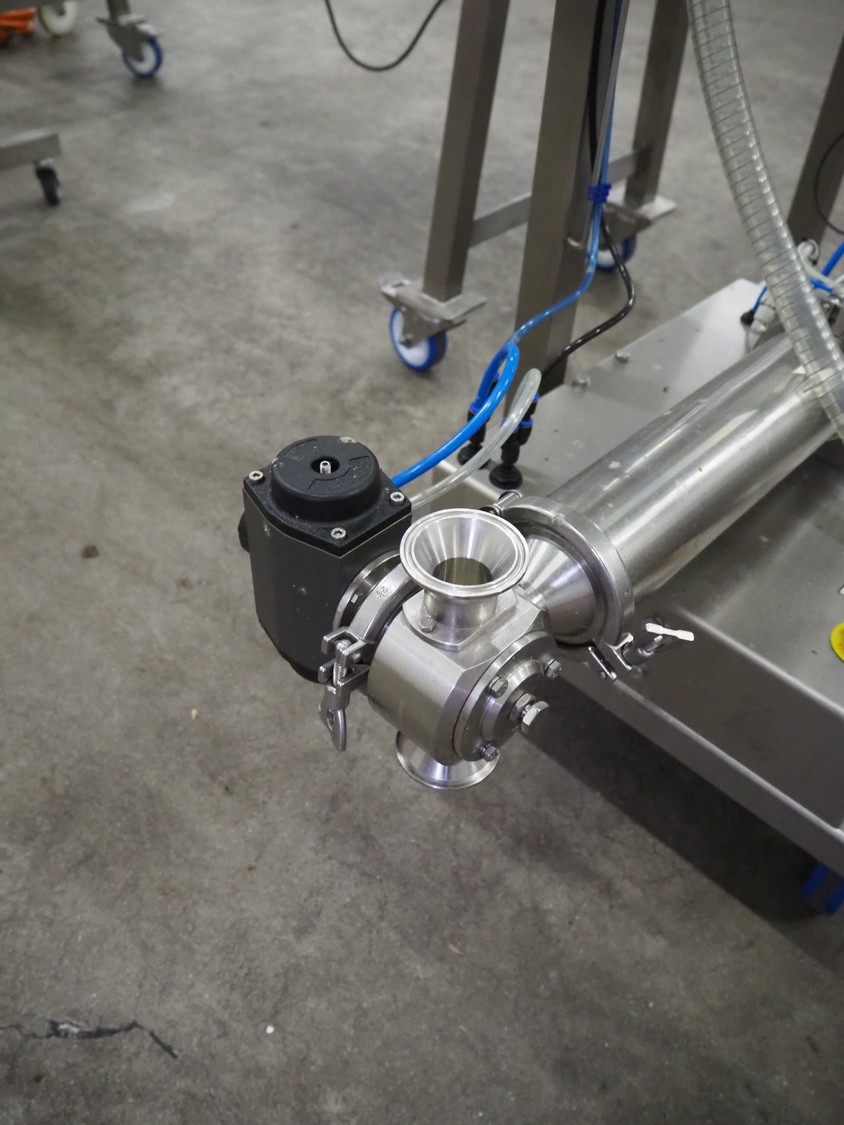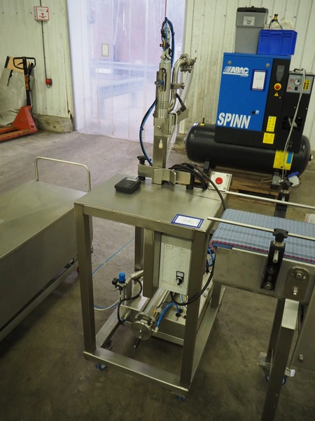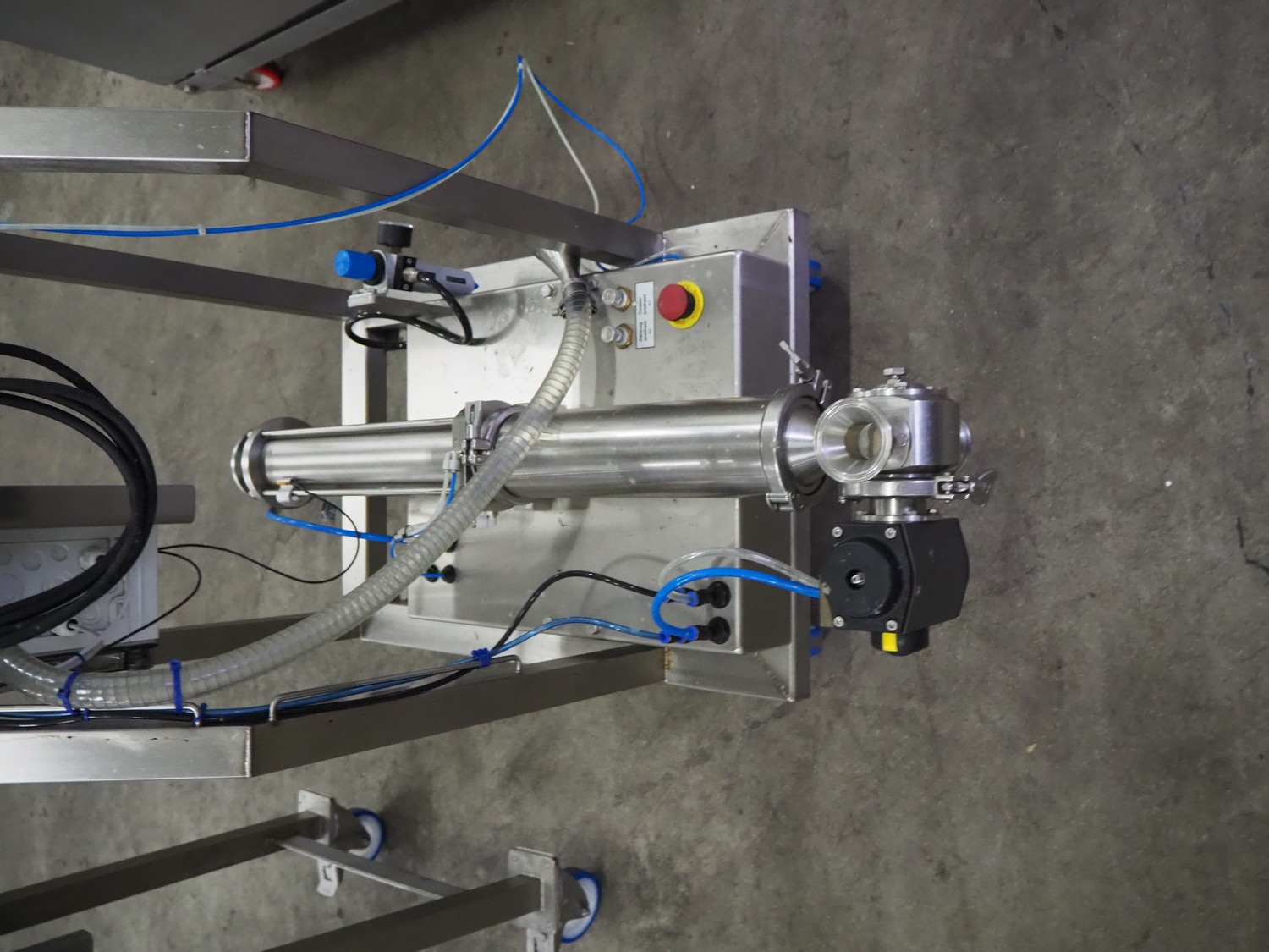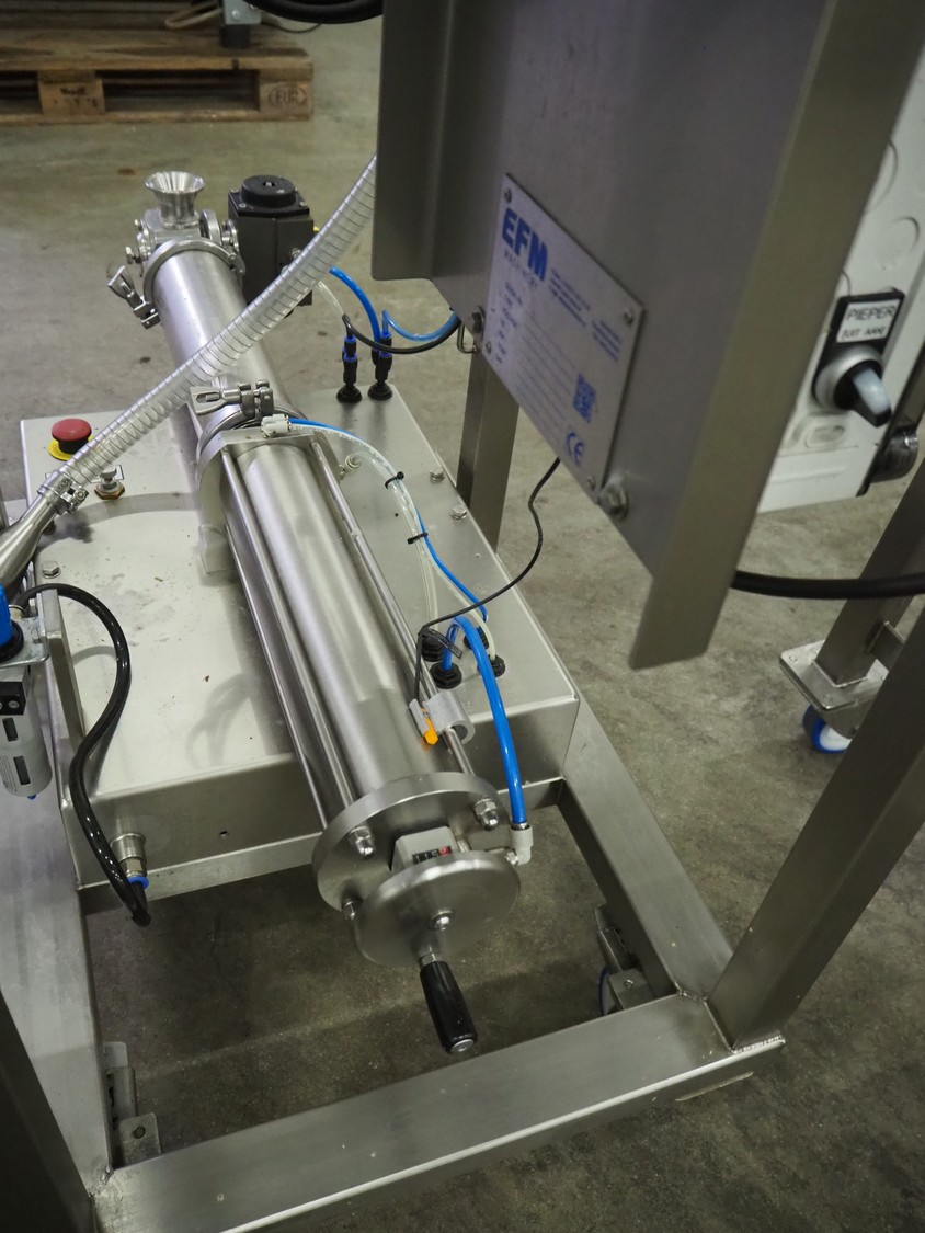 EFM Machinery mobile semi-automatic piston filling machine used for filling buckets, type: V1100, serial number: 21180, year of construction: 2022, 230 V, 50 Hz, 0.12 kW, 6 bar, filling range buckets: 50-5000 ml, dimensions: 1000 mm x 500 mm x 1500 mm.