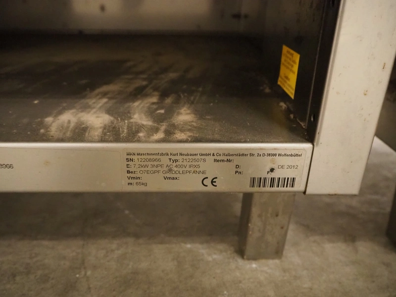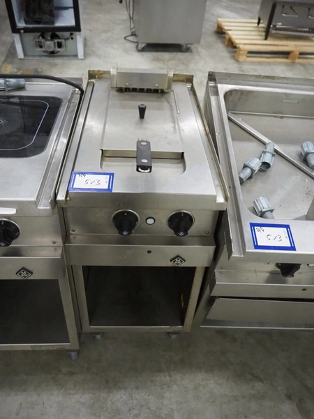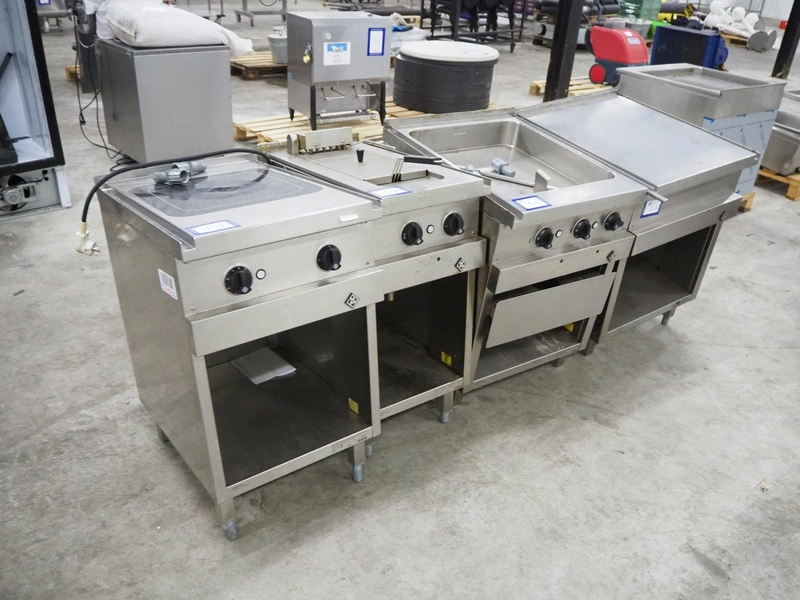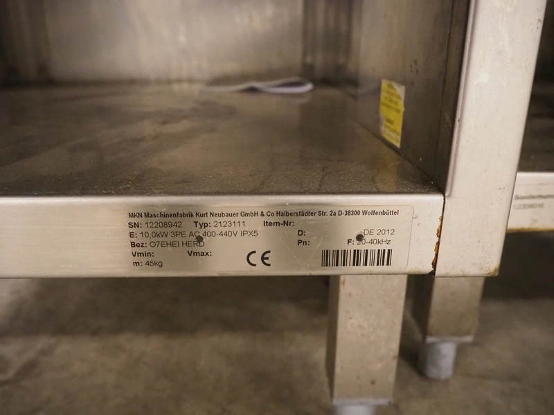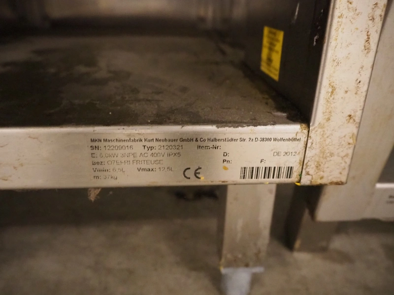 MKN kitchen equipment, consisting of: MKN induction plate, type: 2123111, serial number: 12208942, year of construction: 2012, 400-440 V, 3 Ph, 10 kW, dimensions: 500 mm x 700 mm x 900 mm, MKN fryer, type: 2120321, serial number: 12209016, year of construction: 2012, 400 V, 3 Ph, 6 kW, dimensions: 400 mm x 700 mm x 900 mm, MKN griddle, type: 2122507S, serial number: 12208966, year of construction: 2012, 400 V, 3 Ph, 57.2 kW, MKN kitchen counter, dimensions: 600 mm x 700 mm x 900 mm.