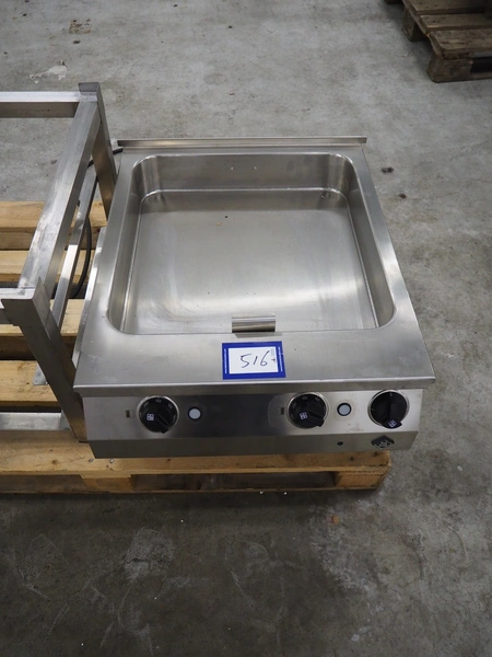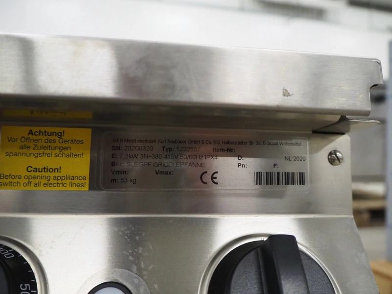 MKN grill plate, type: 1222507, serial number: 20200320, year of construction: 2020, 380-415 V, 3 Ph, 50/60 Hz, 7.2 kW, inside dimensions: 515 mm x 545 mm x 100 mm, total dimensions: 600 mm x 700 mm x 800 mm.