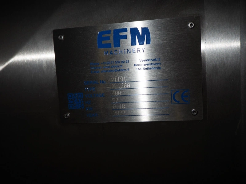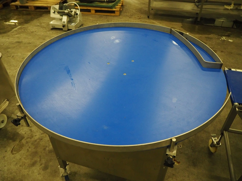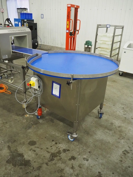 EFM Machinery mobile turning table with plastic worktop, type: AF1200, serial number: 21191, year of construction: 2022, 400 V, 50 Hz, 0.18 A, diameter table top: 1200 mm, total dimensions: 1220 mm x 1220 mm x 990 mm.