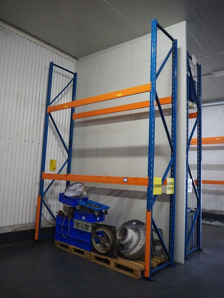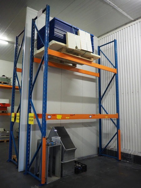 Steel pallet racks, consisting of: 12 uprights, dimensions: 960 mm x 4500 mm, 28 beams, length: 3300 mm.