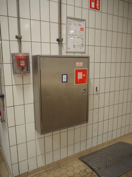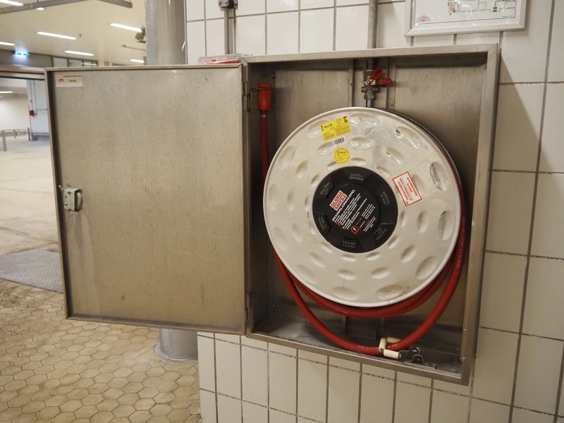S/s cabinet with Gloria Smeba fire hose reel, dimensions: 730 mm x 180 mm x 940 mm.