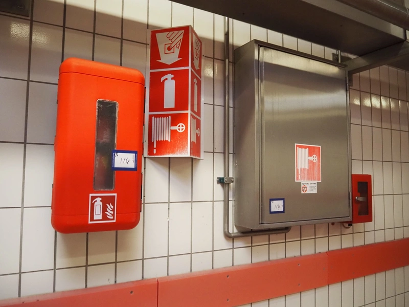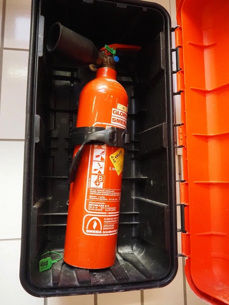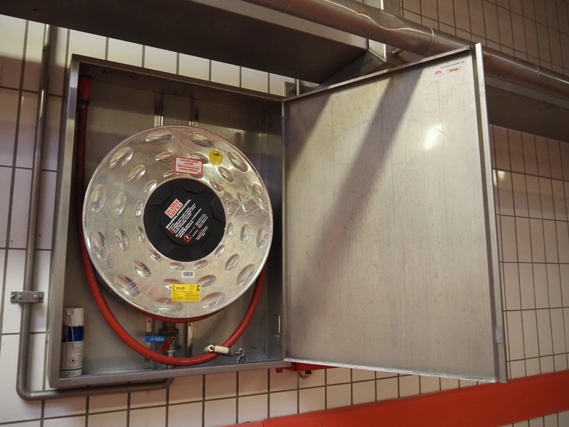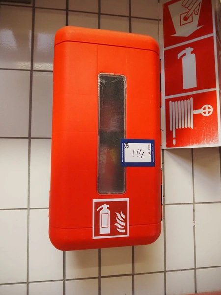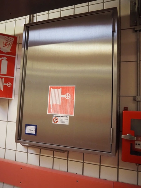 S/s cabinet with Gloria Smeba fire hose reel and plastic cabinet with Gloria Smeba fire extinguisher, dimensions fire hose reel: 730 mm x 180 mm x 940 mm, dimensions fire extinguisher cabinet: 320 mm x 270 mm x 830 mm.