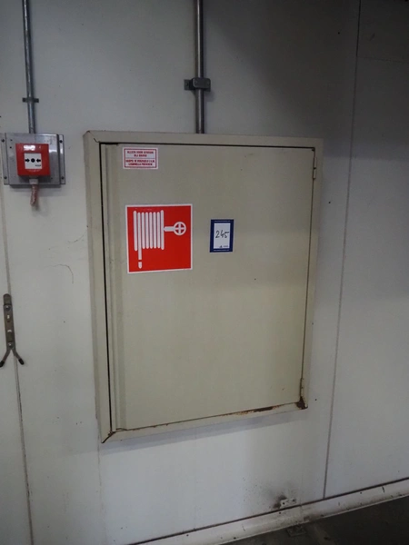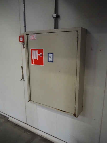Steel cabinet with Velco fire hose reel, dimensions: 730 mm x 180 mm x 940 mm.