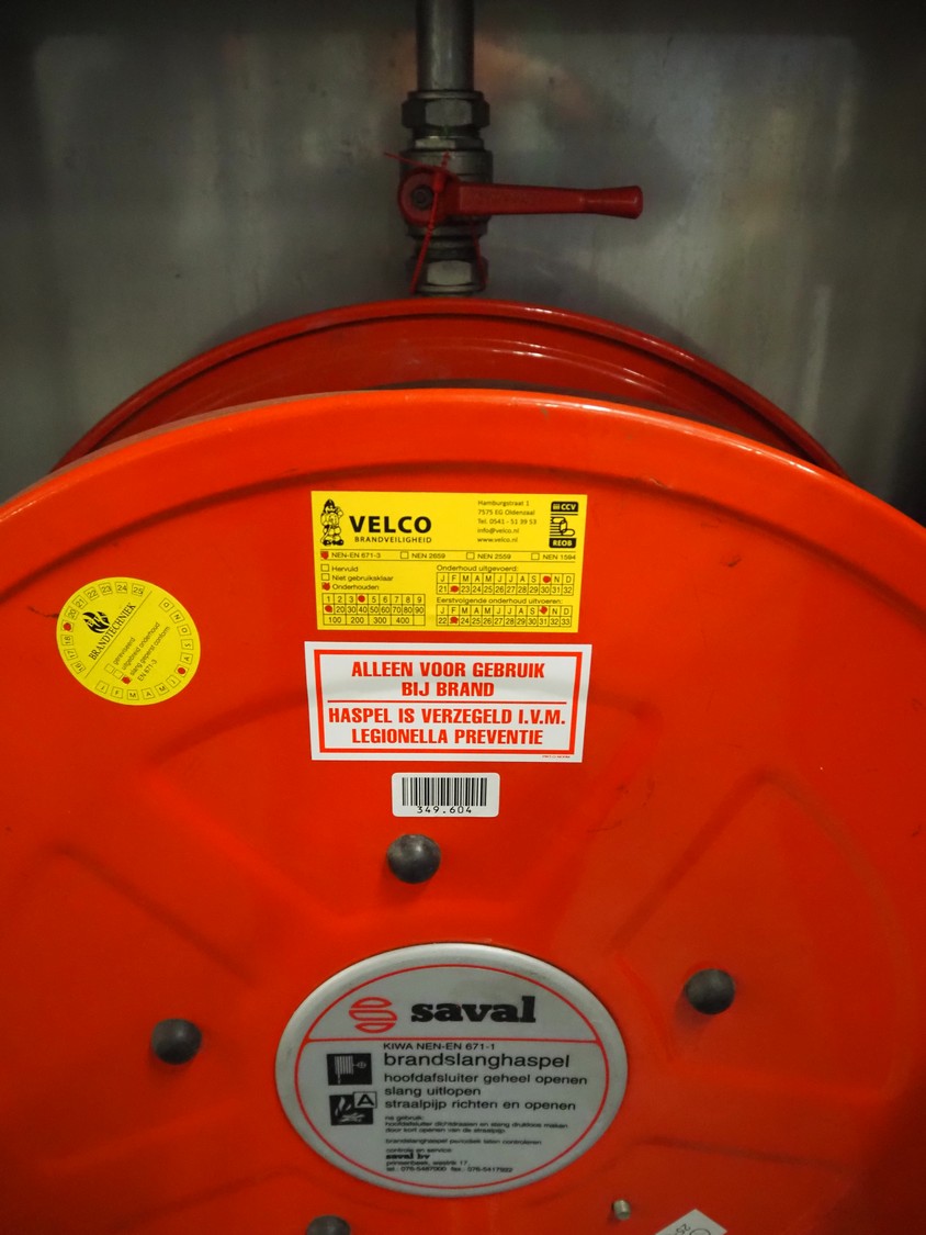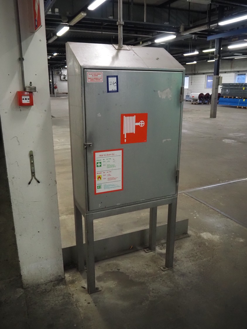 S/s cabinet with Saval fire hose reel, dimensions: 740 mm x 350 mm x 1760 mm.