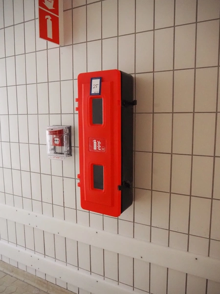 Plastic fire extinguisher cabinet, dimensions: 320 mm x 270 mm x 830 mm. Fire extinguisher is missing.