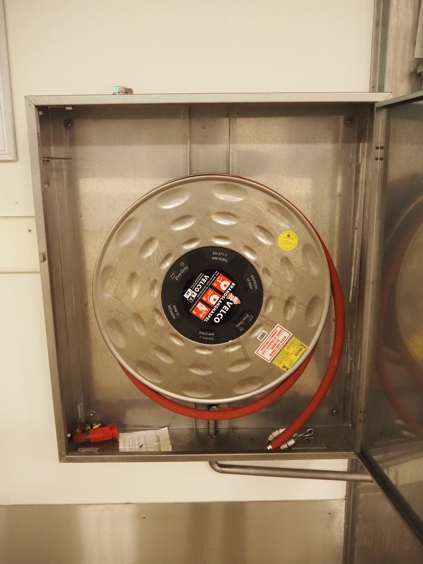S/s cabinet with Velco fire hose reel, dimensions: 850 mm x 180 mm x 950 mm.
