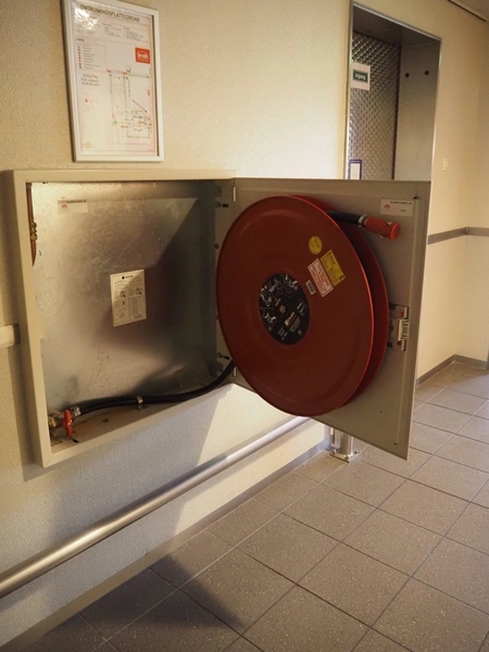 Steel cabinet with Noha fire hose reel, dimensions: 850 mm x 140 mm x 850 mm.