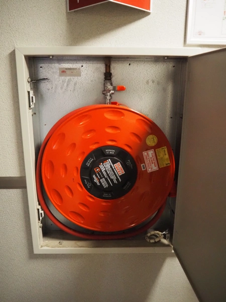 Steel cabinet with Gloria Smeba fire hose reel and Velco fire extinguisher, dimensions fire hose reel: 730 mm x 180 mm x 940 mm.