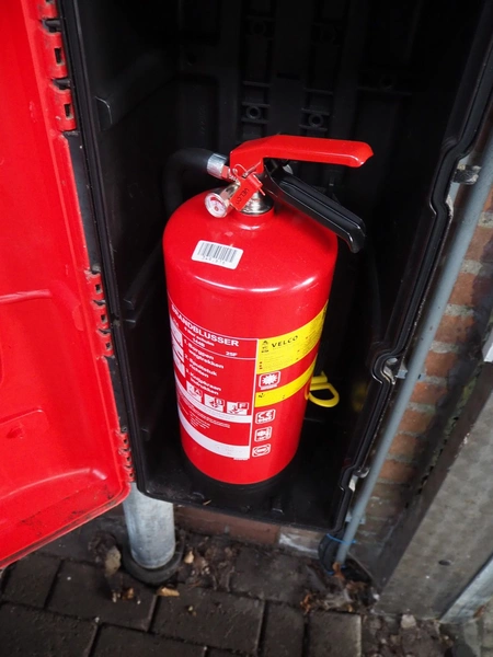 Plastic cabinet with Velco fire-extinguisher, dimensions: 300 mm x 260 mm x 670 mm.
