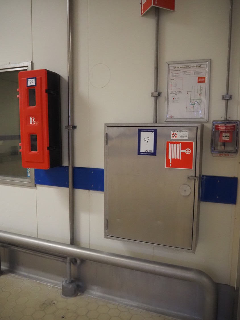 S/s cabinet with BTN fire hose reel and plastic fire extinguisher cabinet, dimensions fire hose reel: 730 mm x 180 mm x 940 mm, dimensions fire extinguisher cabinet: 320 mm x 270 mm x 830 mm. Fire extinguisher is missing.