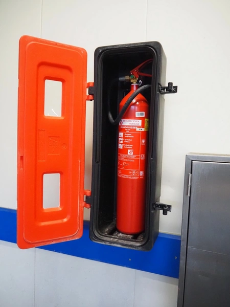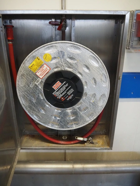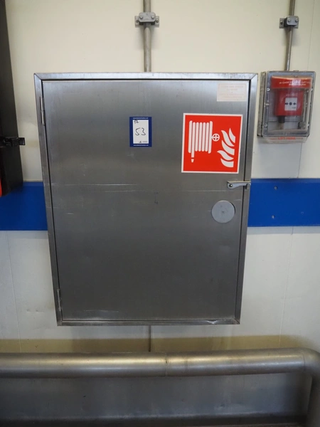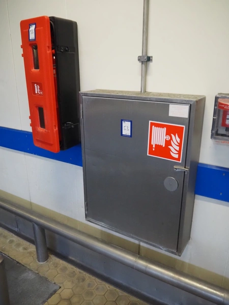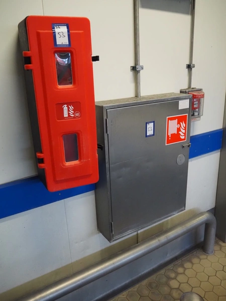 S/s cabinet with Gloria Smeba fire hose reel and plastic cabinet with BTN fire extinguisher, dimensions fire hose reel: 730 mm x 180 mm x 940 mm, dimensions fire extinguisher cabinet: 320 mm x 270 mm x 830 mm.