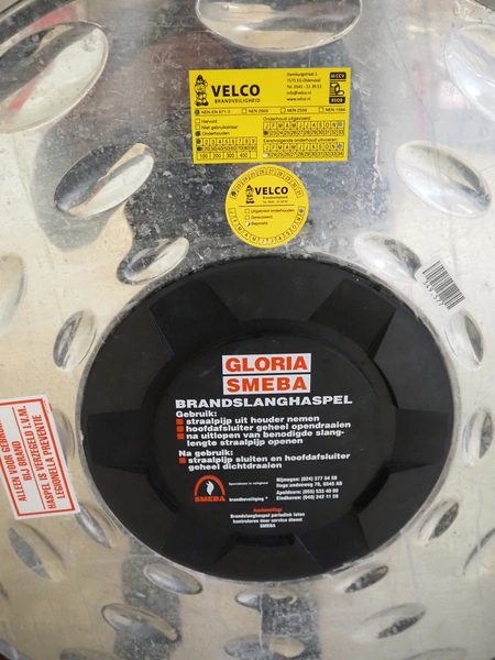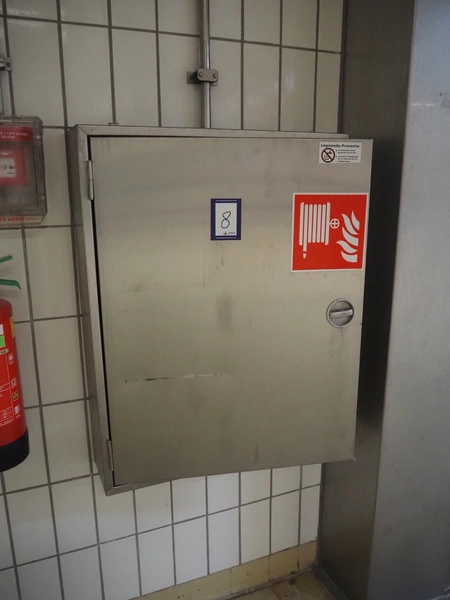 S/s cabinet with Gloria Smeba fire hose reel, dimensions: 730 mm x 180 mm x 940 mm.