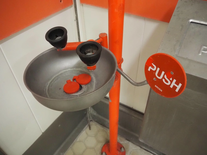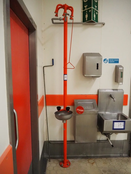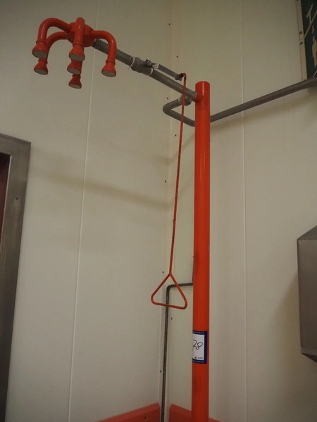 Safety shower, dimensions: 460 mm x 640 mm x 2380 mm.