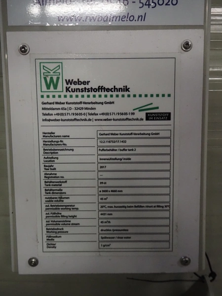 Gerhard Weber Kunststoff-Verarbeitung GmbH plastic buffer tank, serial number: 12.2.116732/17.1432, year of construction: 2017, volume: 45 m³, dimensions: ø 3600 mm x 4660 mm. Can be picked-up at a later date as soon as the building will be demolished next year, a date for this is yet unknown.