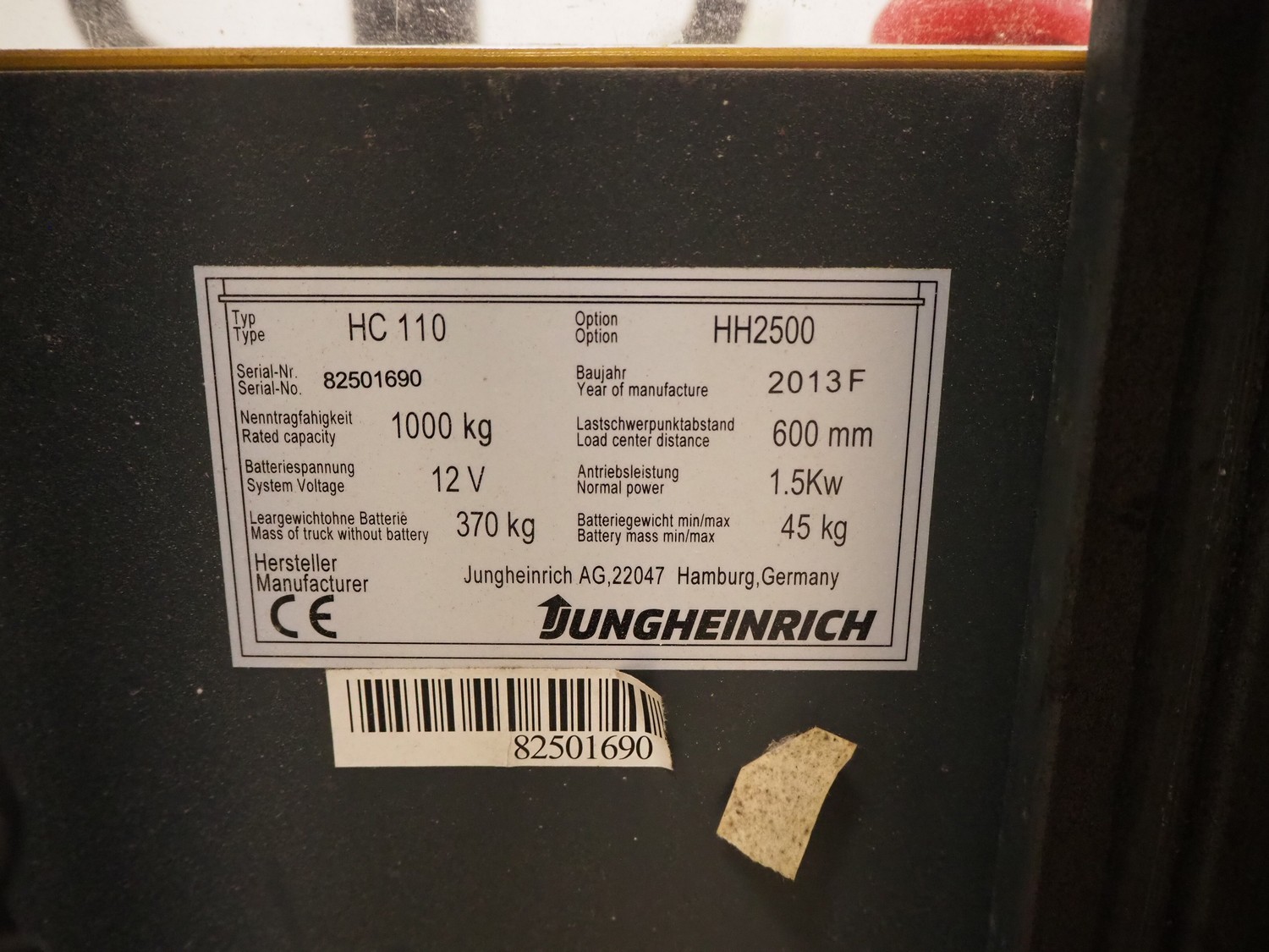 Jungheinrich electric pallet lifter, type: HC 110, serial number: 82501690, year of construction: 2013, 12 V, 1.5 kW, capacity: 1000 kg, fork length: 1000 mm, total dimensions: 1760 mm x 770 mm x 1780 mm.