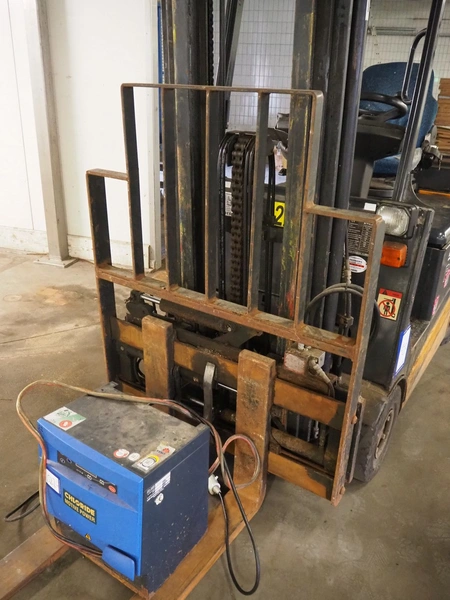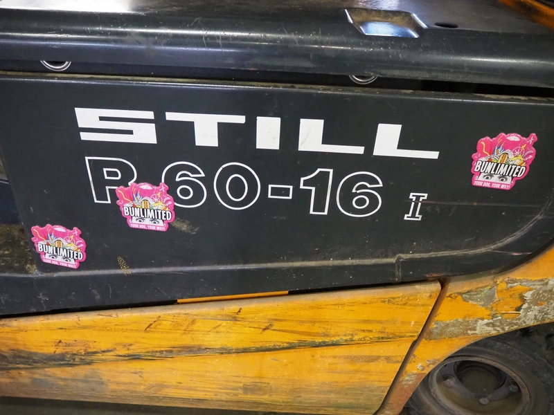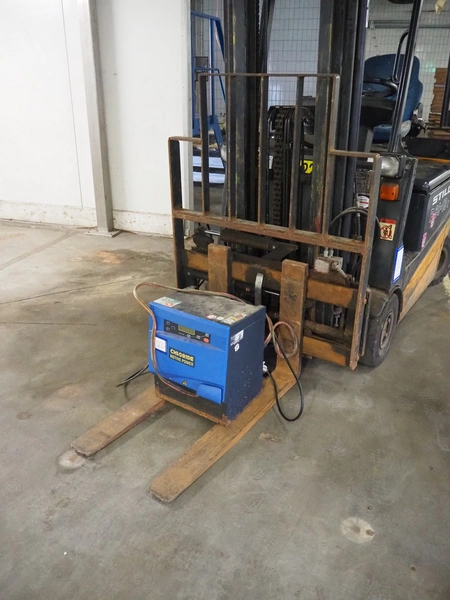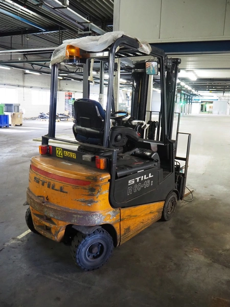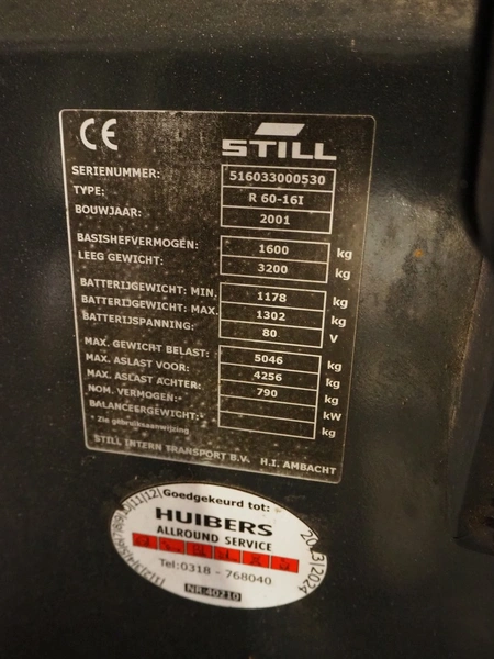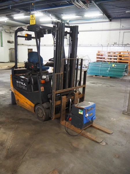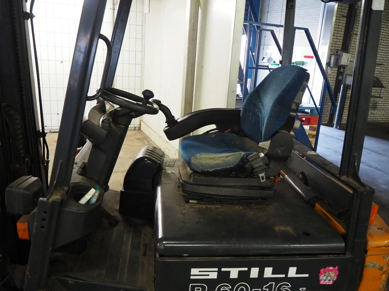 Still electrical forklift truck, type: R 60-16I, serial number: 516033000530, year of construction: 2001, capacity: 1600 kg, weight without battery: 3200 kg, min/max battery weight: 1178/1302 kg, for length: 1000 mm, total dimensions: 3040 mm x 1120 mm x 2170 mm, including battery charger, dimensions: 410 mm x 320 mm x 510 mm.