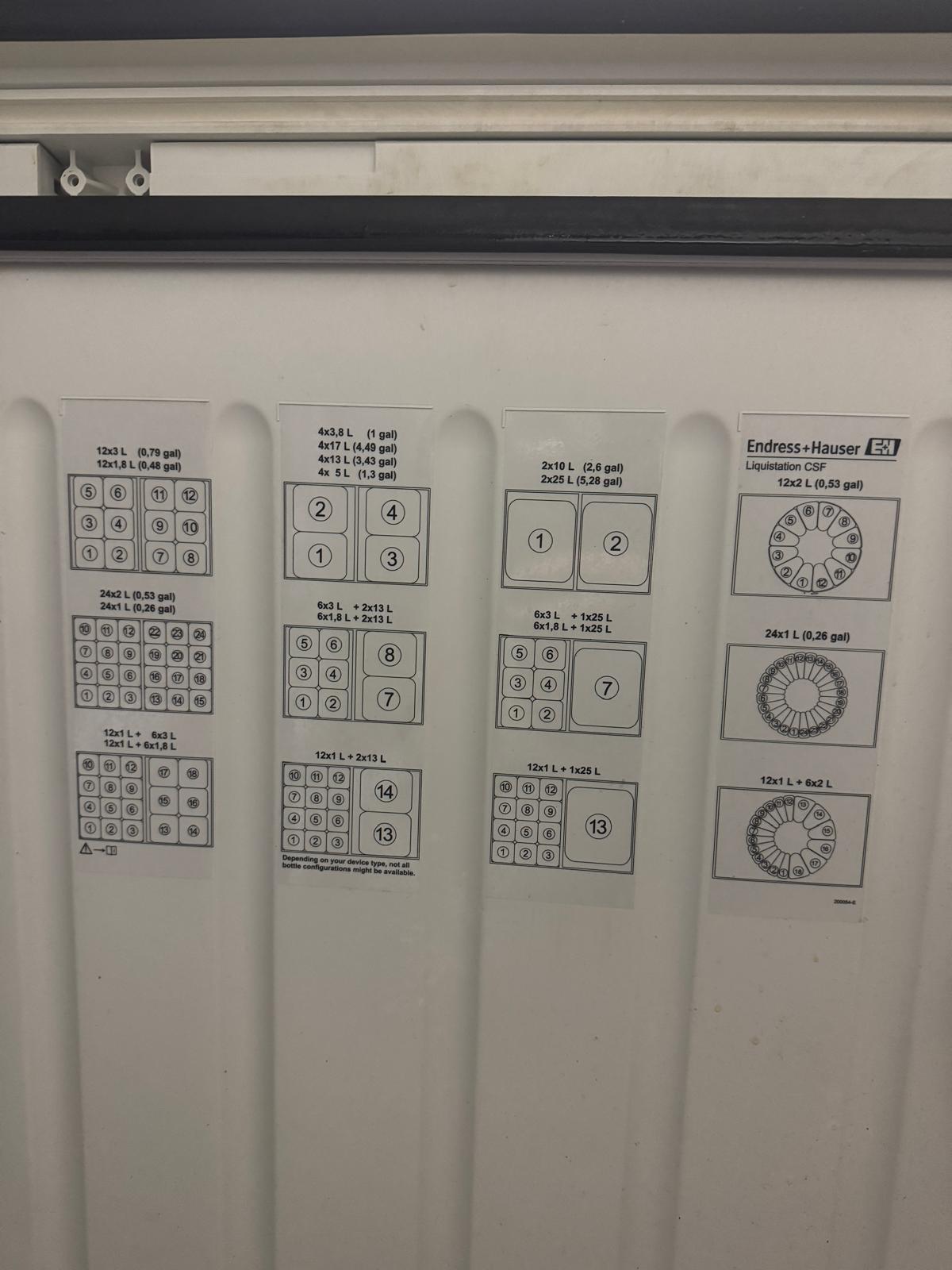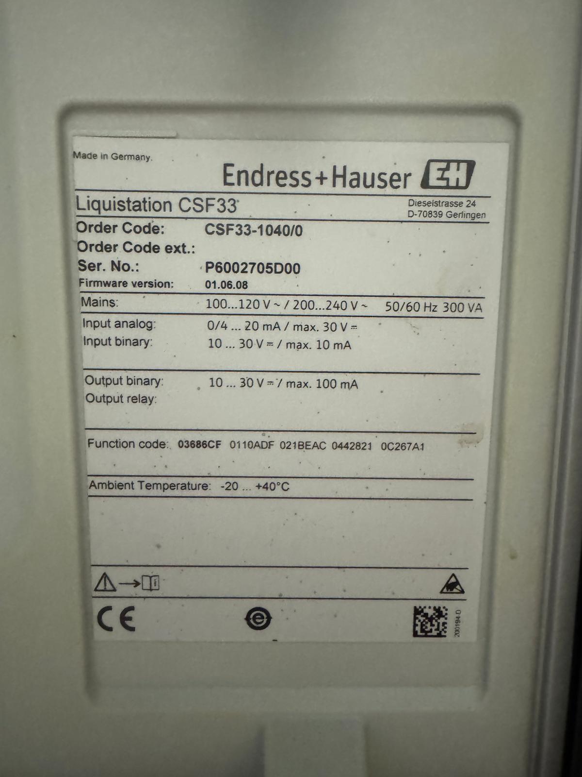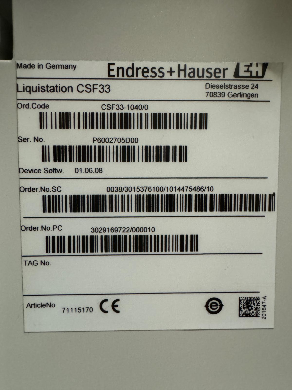 Endress + Hauser stationary sampler for liquid media, model: Liquistation CSF33, serial number: P6002705D00, firmware version: 06.06.08, dimensions: 750 mm x 620 mm x 1250 mm.