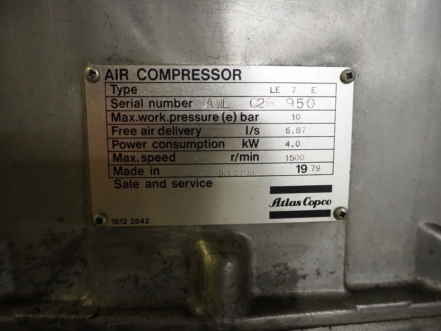 Atlas Copco air compressor, type: LE 7 E, serial number: AML 026 950, year of construction: 1979, 10 bar, dimensions: 1200 mm x 800 mm x 1200 mm.