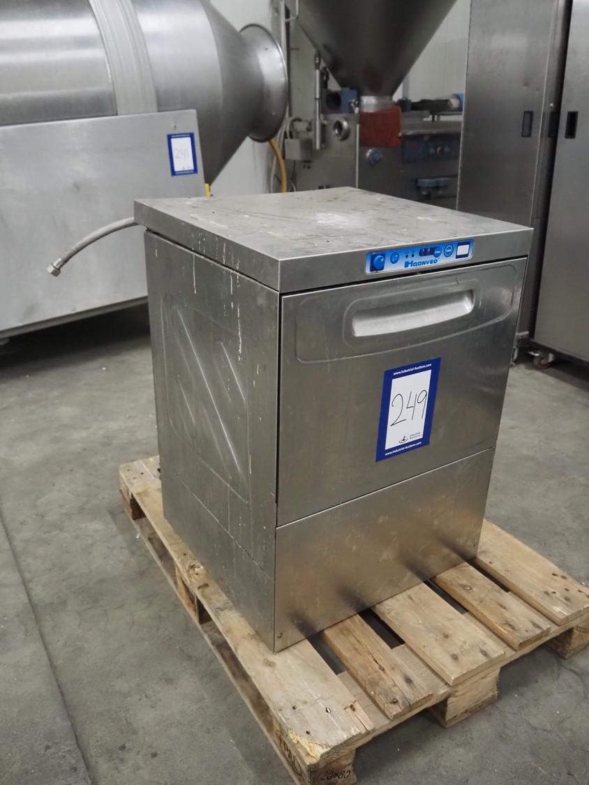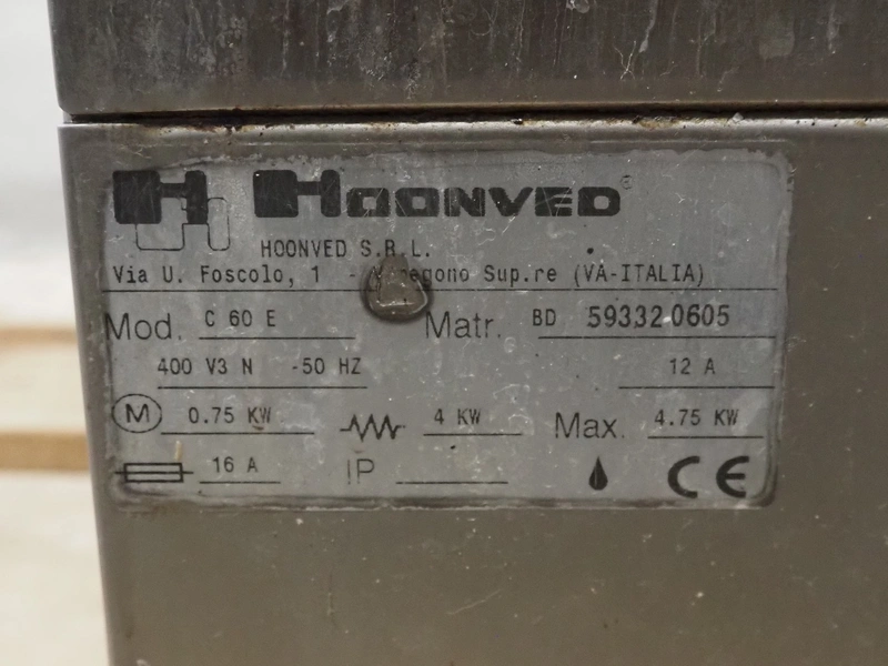 Hoonved dishwasher, model: C 60 E, serial number: BD 593320605, 400 V, 3 Ph, 50 Hz, 16 A, 4.75 kW, dimensions crate: 460 mm x 460 mm x 85 mm, total dimensions: 600 mm x 600 mm x 815 mm.