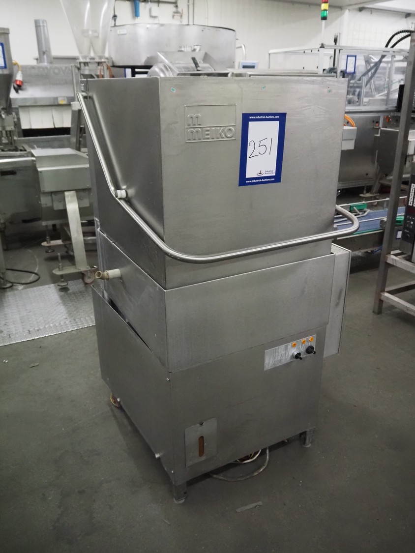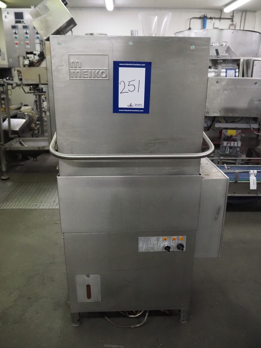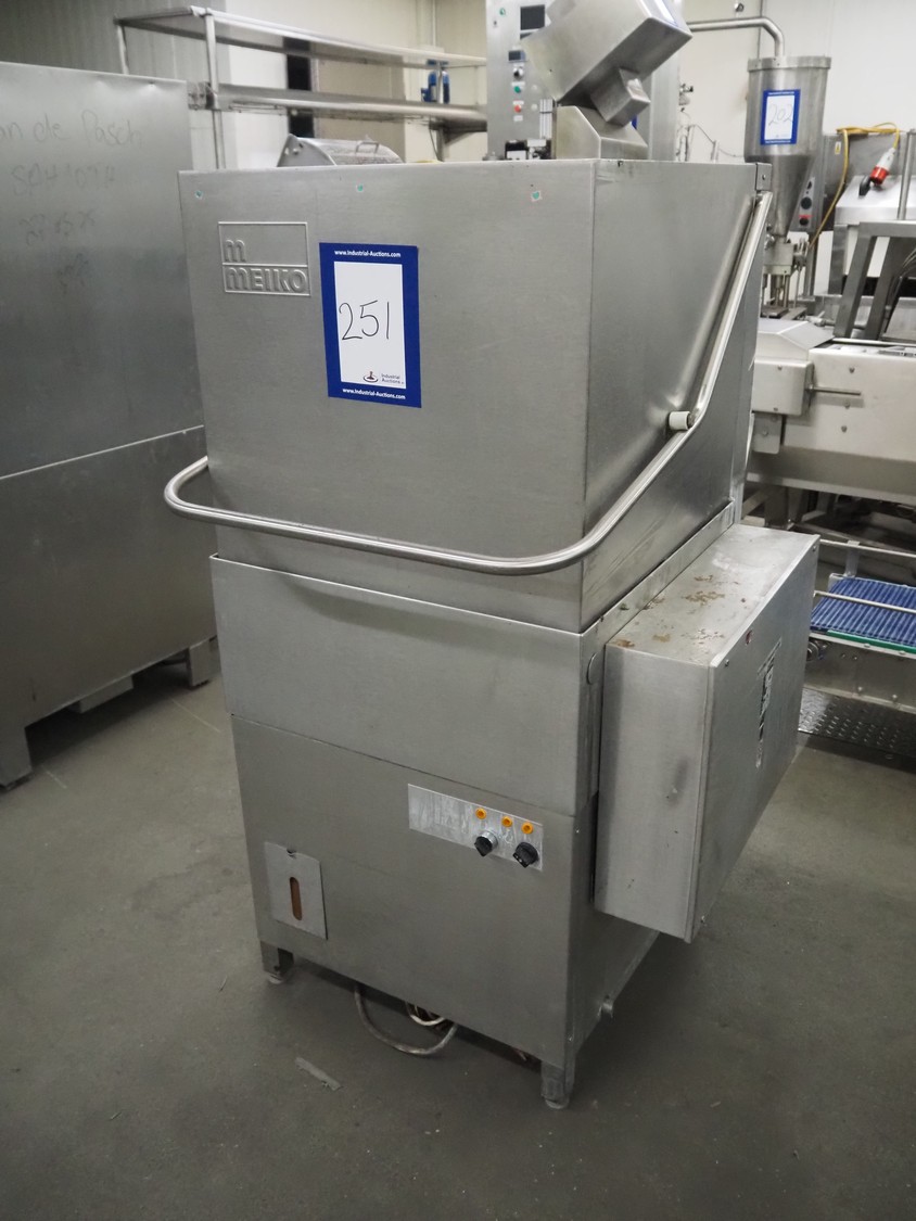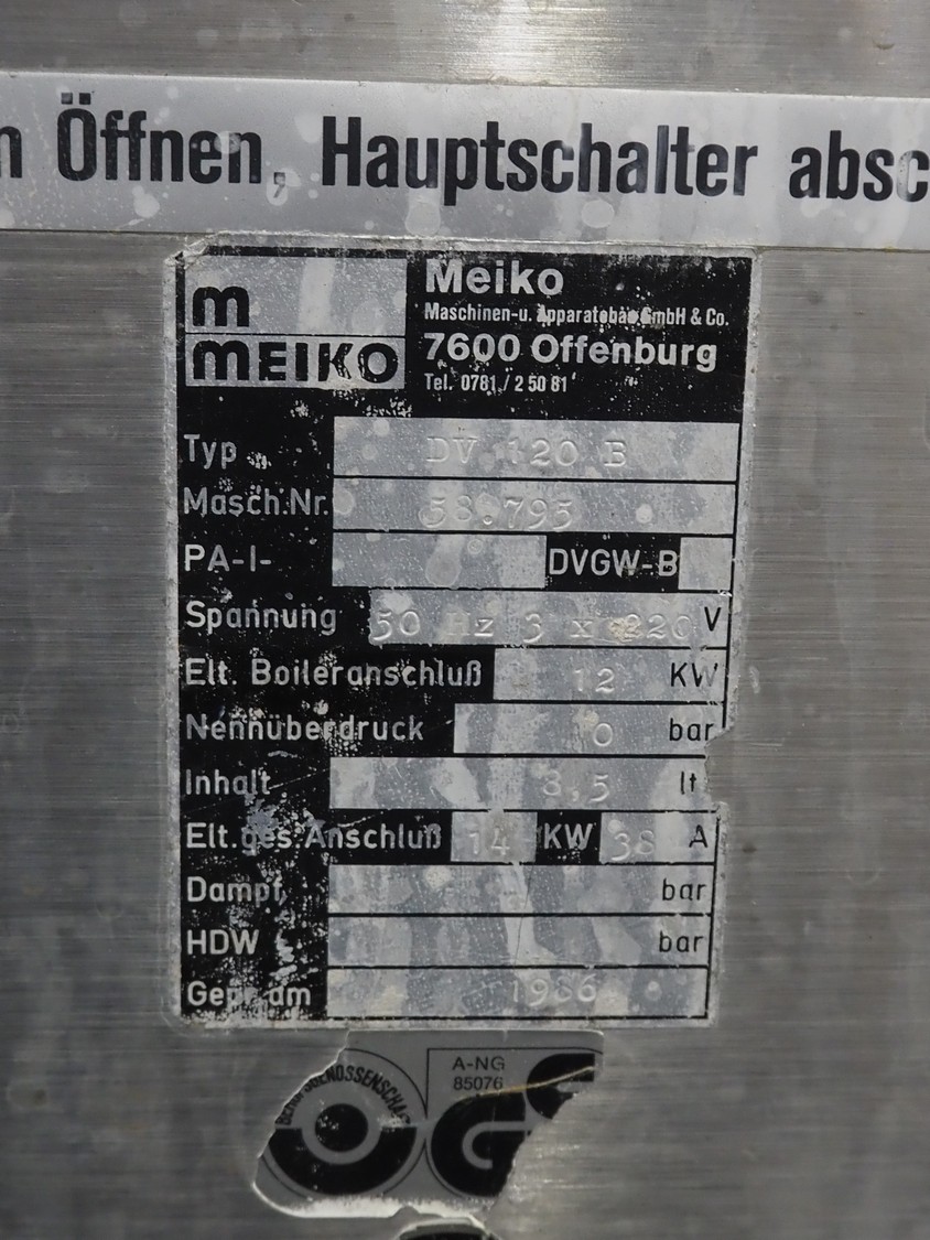 Meiko dishwasher, type DV 120 B, machine number: 58.795, 220 V, 3 Ph, 50 Hz, 38 A, 14 kW, inside dimensions: 520 mm x 520 mm, total dimensions: 850 mm x 800 mm x 1375 mm. Missing back panel.