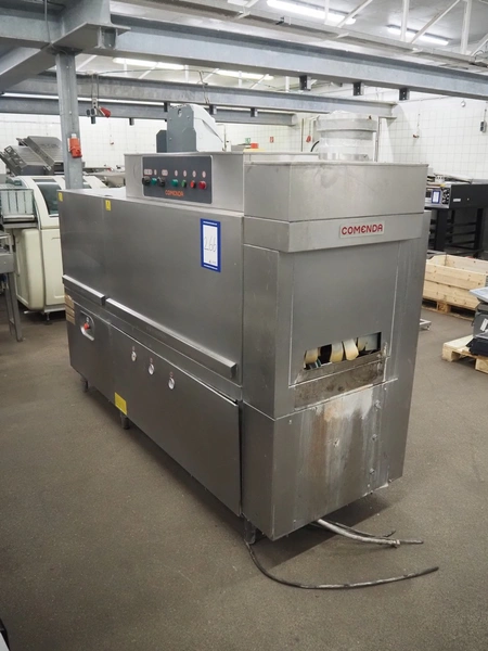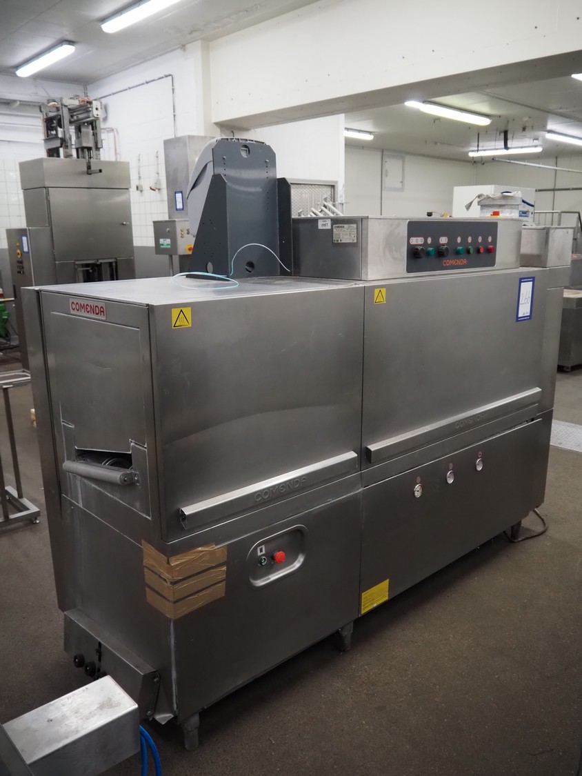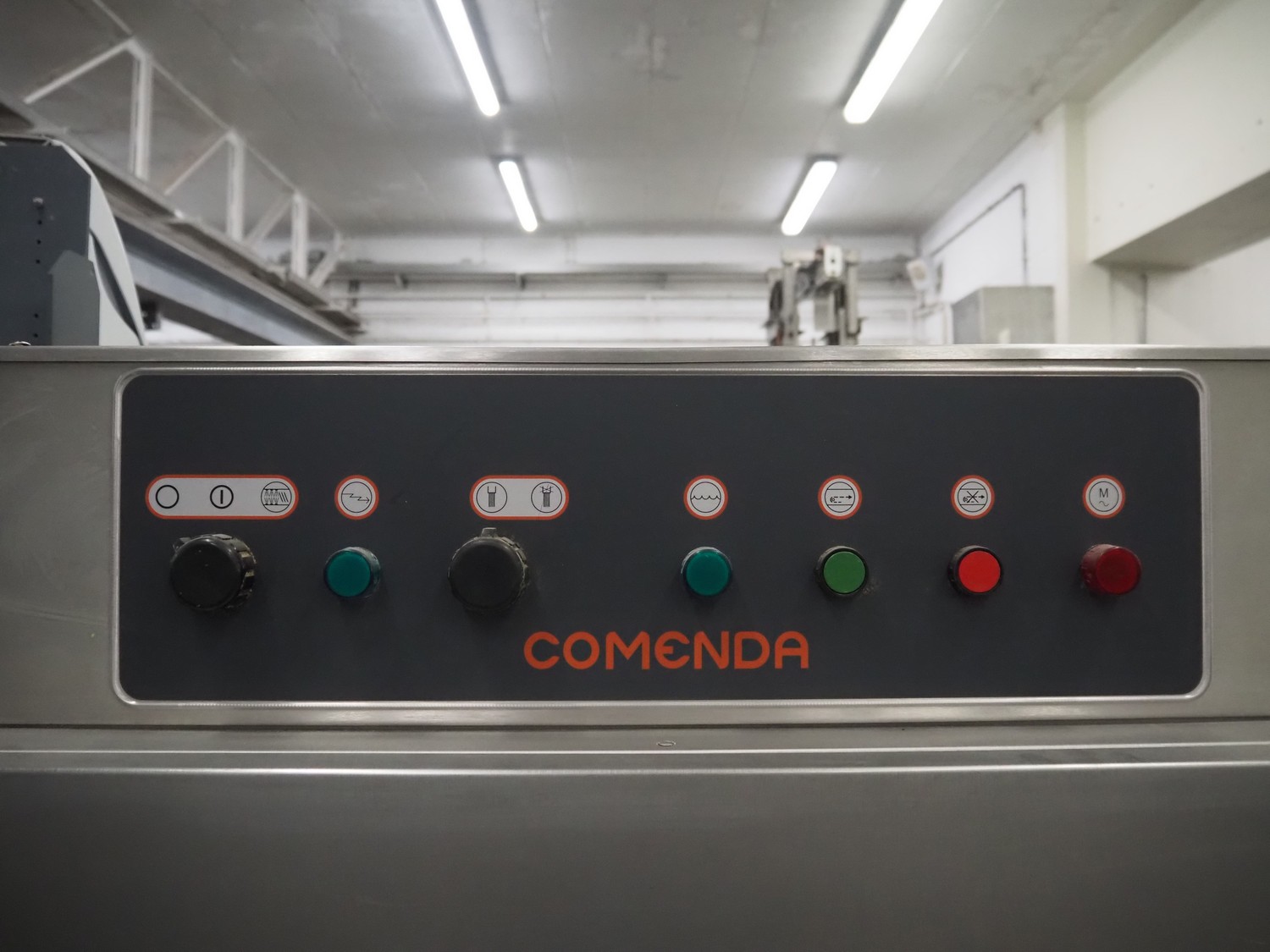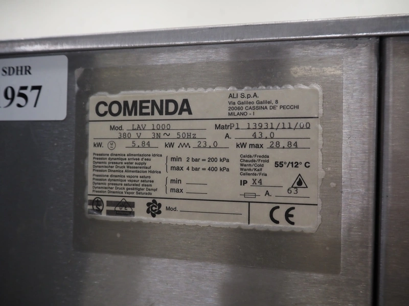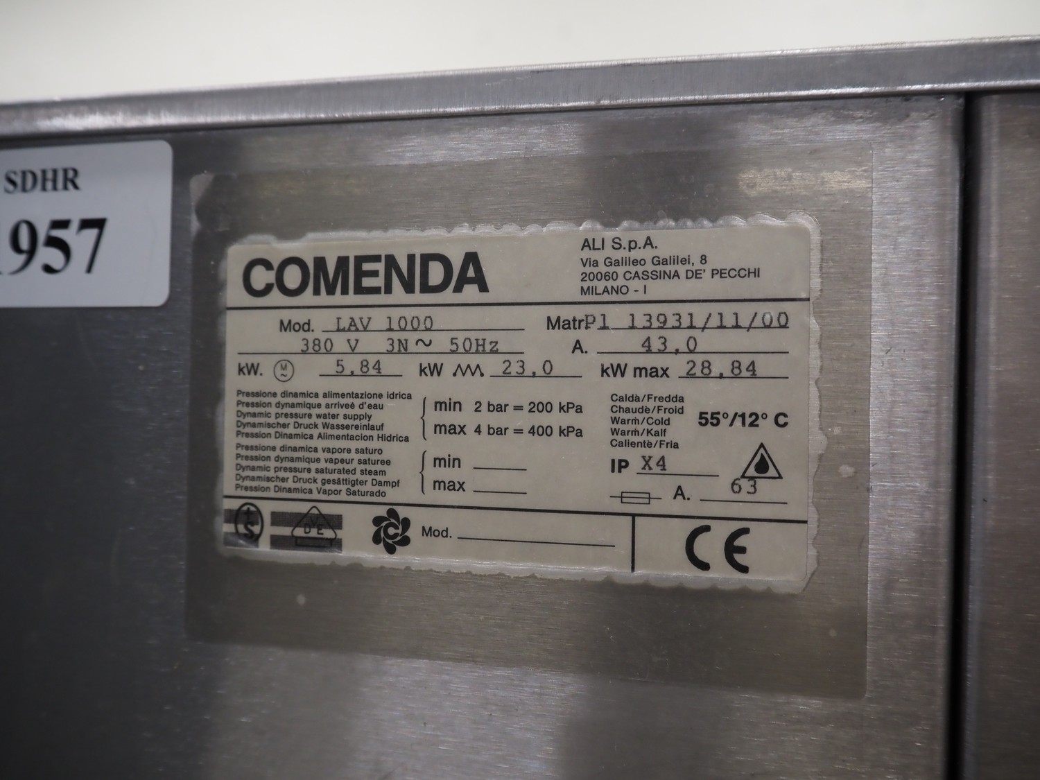 Comenda plate washer, type: LAV 1000, model: P1 13931/11/00, 380 V, 3 Ph, 50 Hz, 28.84 kW, 43 A, clearance: 385 mm x 35 mm, total dimensions: 2460 mm x 900 mm x 1950 mm.